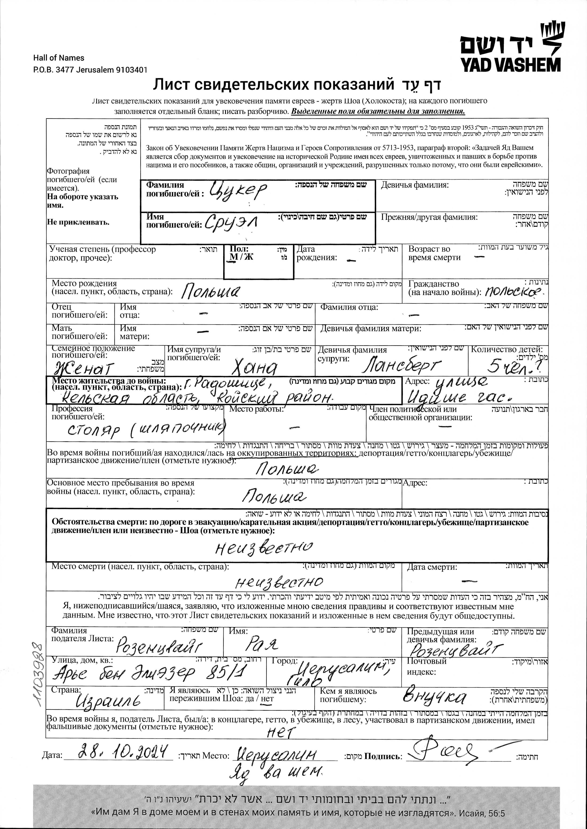 Sruyel Tzuker wurde in Polen geboren. Er war Zimmermann und mit Khana, geb. Lansberg Verheiratet. Vor dem Zweiten Weltkrieg lebte er in Radoszice, Polen. Während des Krieges war er in Polen.