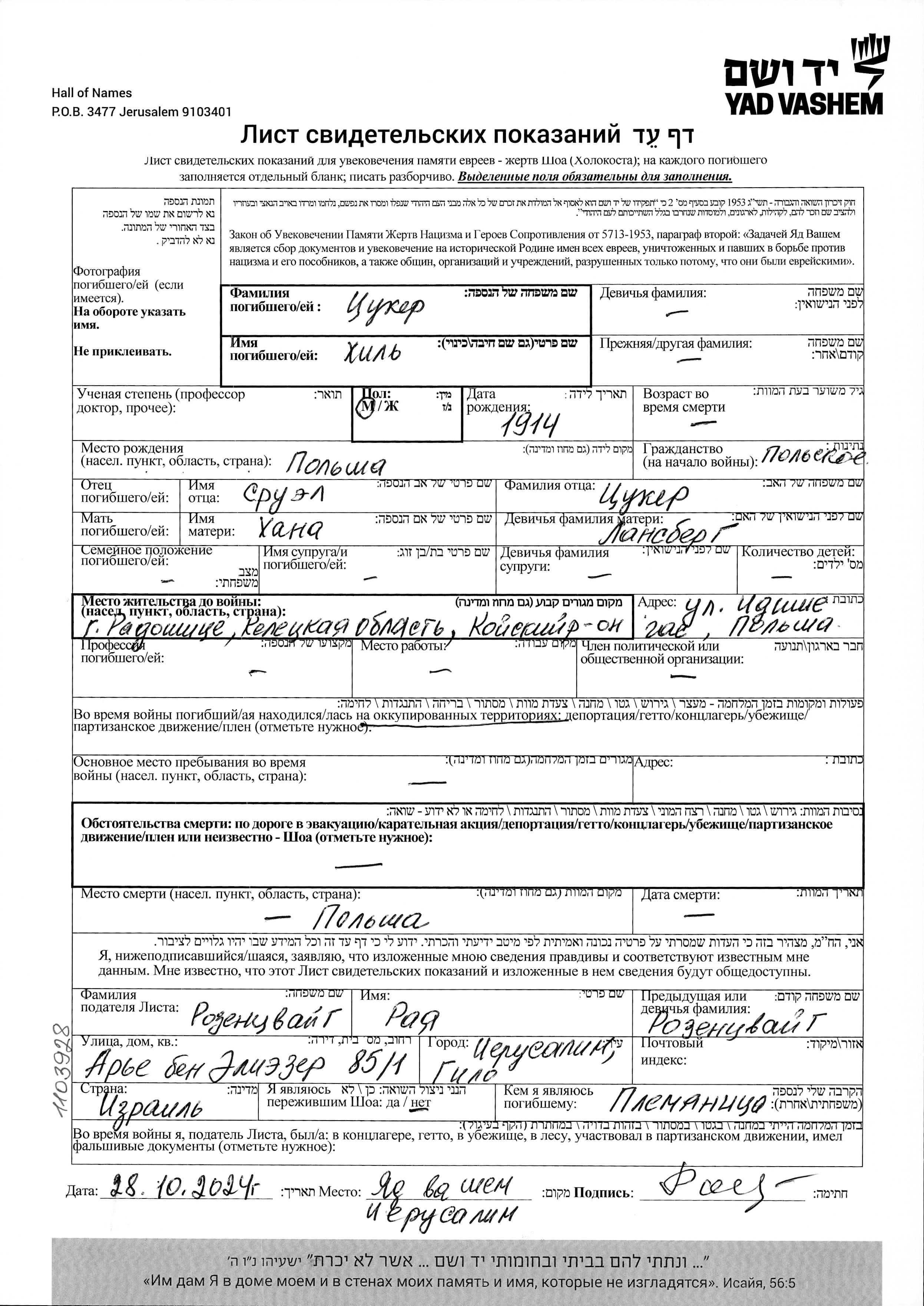 Khil Tzuker wurde im Jahr 1914 in Polen geboren. Er war der Sohn von Sruyel und Khana, geb. Lansberg. Vor dem Zweiten Weltkrieg lebte er in Radoszyce, Polen. Während des Krieges war er in Polen.