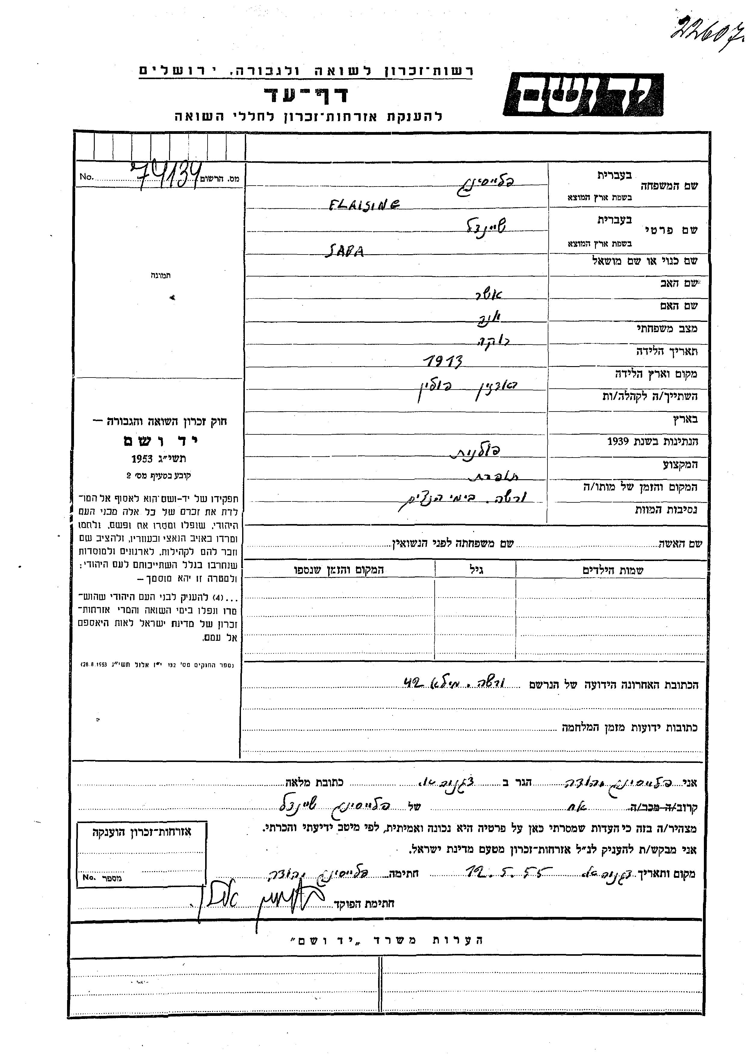 Flaising Sheindl Sara 1913 Radzin, Polen Gedenkblatt