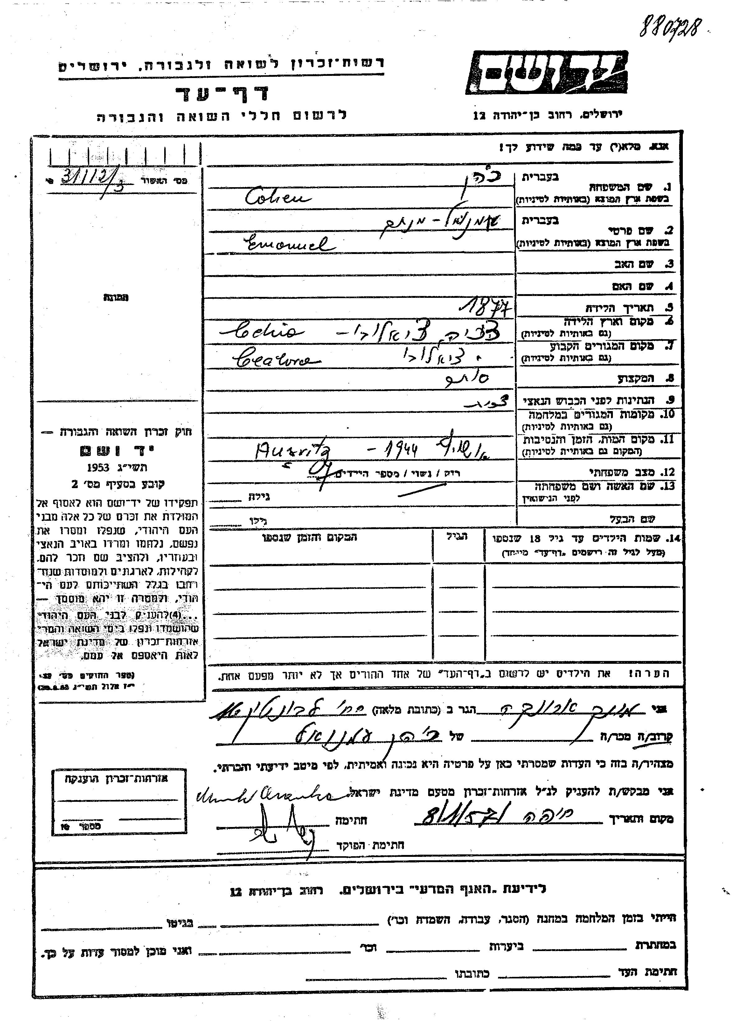Menakhem Emanuel wurde in der Schoah ermordet. Todesort: Auschwitz, Polen im Jahr 1944.