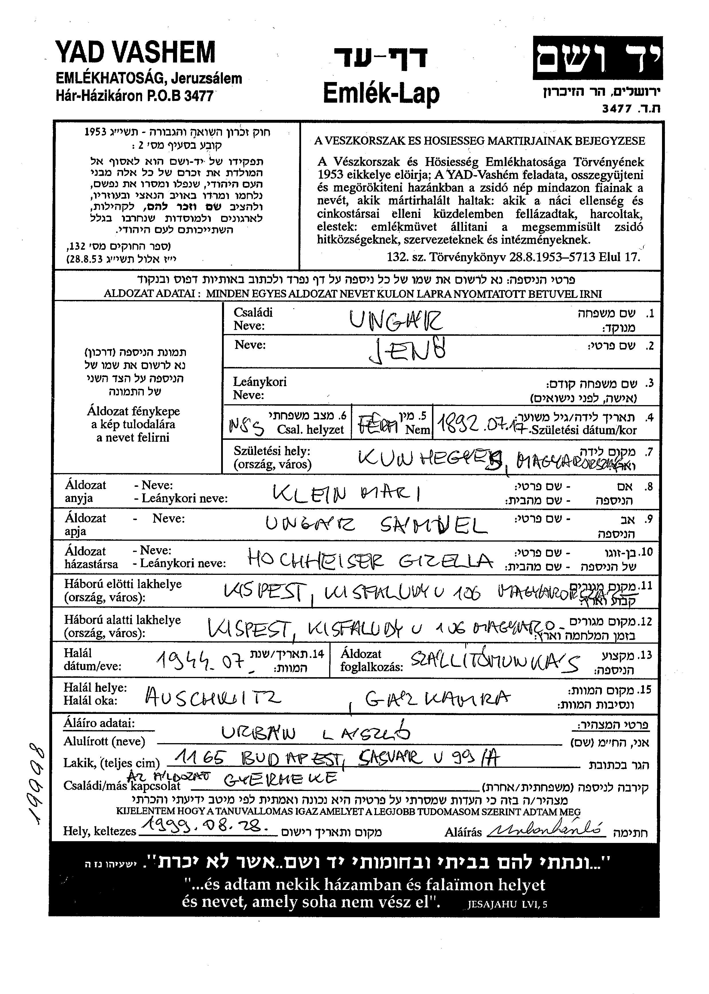 Jeno Ungar wurde im Jahr 1892 in Kunhegyes, Ungarn geboren. Er war Szallitomunkas. Vor dem Zweiten Weltkrieg lebte er in Kispest, Ungarn.