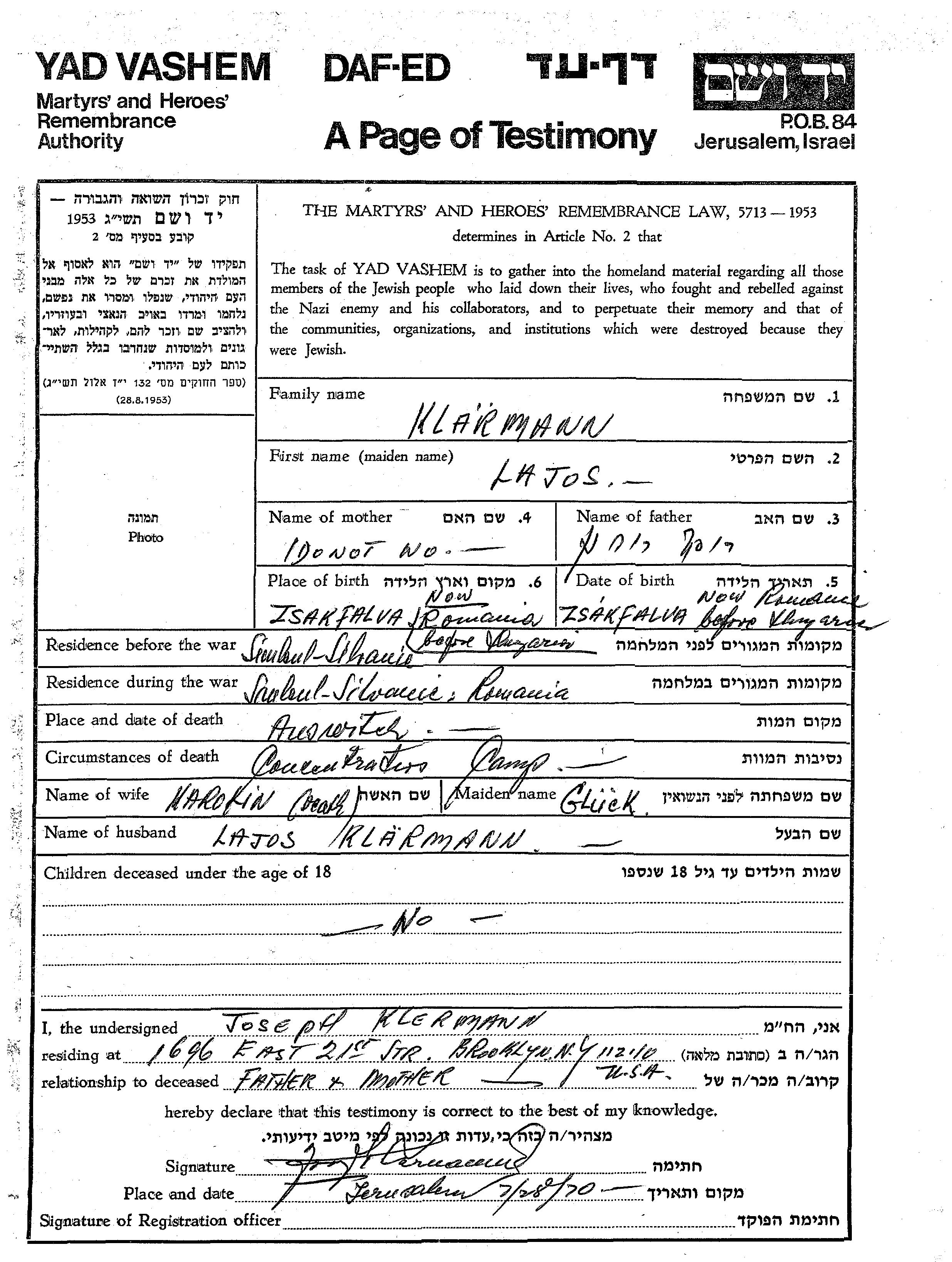 Lajos Klarmann wurde in Zsakfalva, Rumänien geboren. Vor dem Zweiten Weltkrieg lebte er in Simleul Silvaniei, Rumänien.