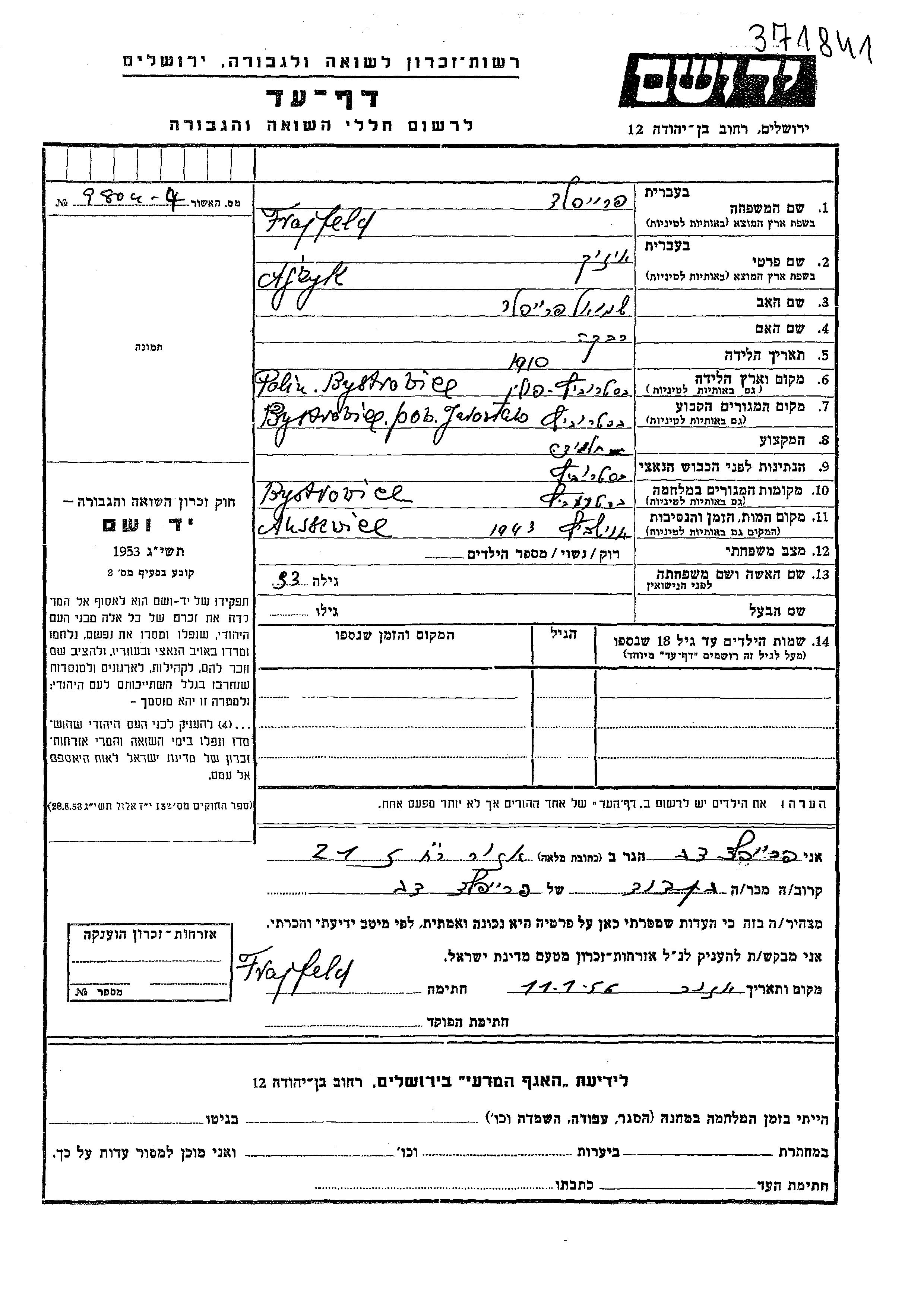 Ajzyk Frajfeld wurde im Jahr 1910 in Bystrowice, Polen geboren. Er war der Sohn von Shmuel und Rivka. Er war Schüler/-in. Vor dem Zweiten Weltkrieg lebte er in Bystrowice, Polen. Während des Krieges war er in Bystrowice, Polen.