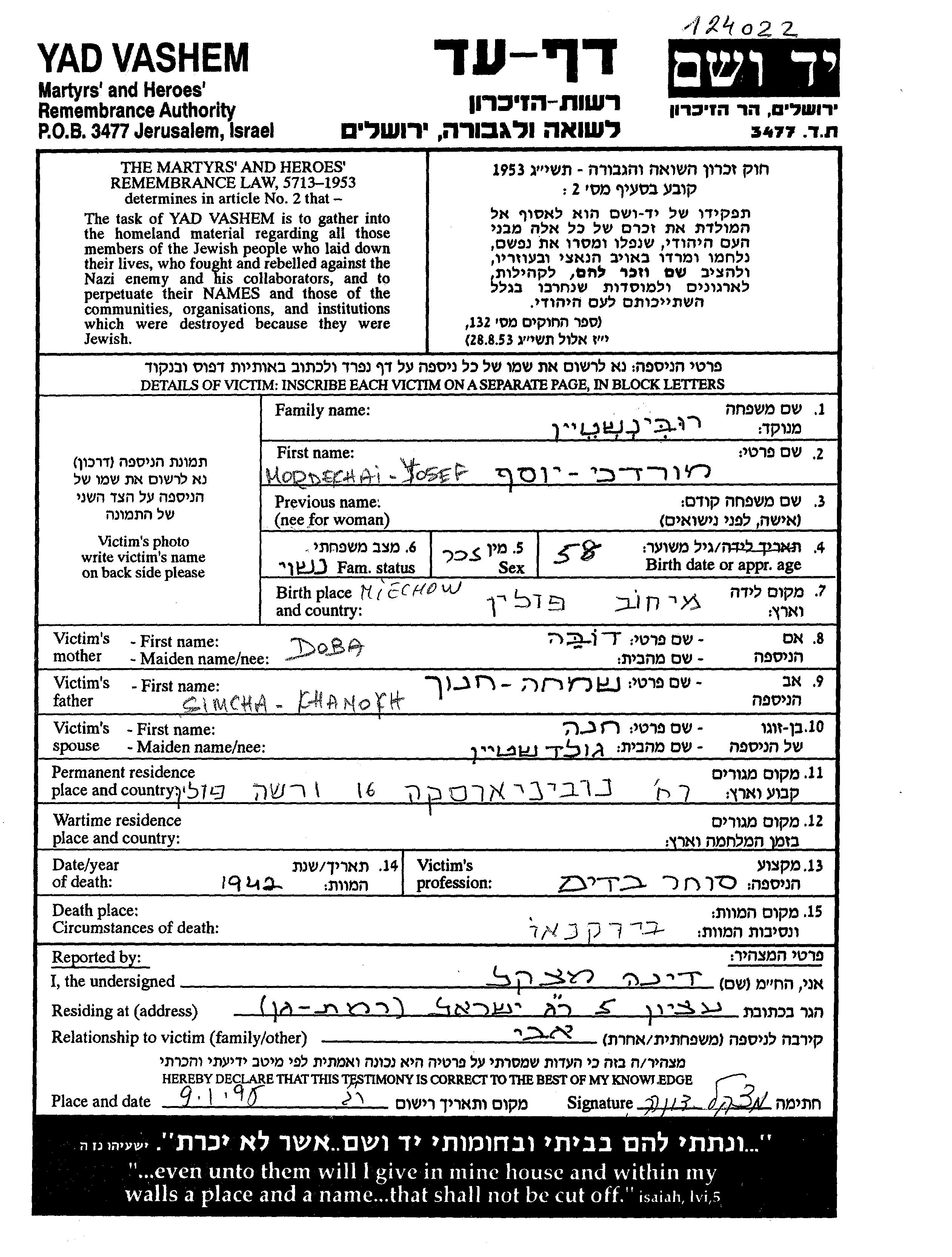 Rubinshtein | Mordekhai Yosef | Warszawa, Polen | Aufzeichnungen ueber ermordete Personen |