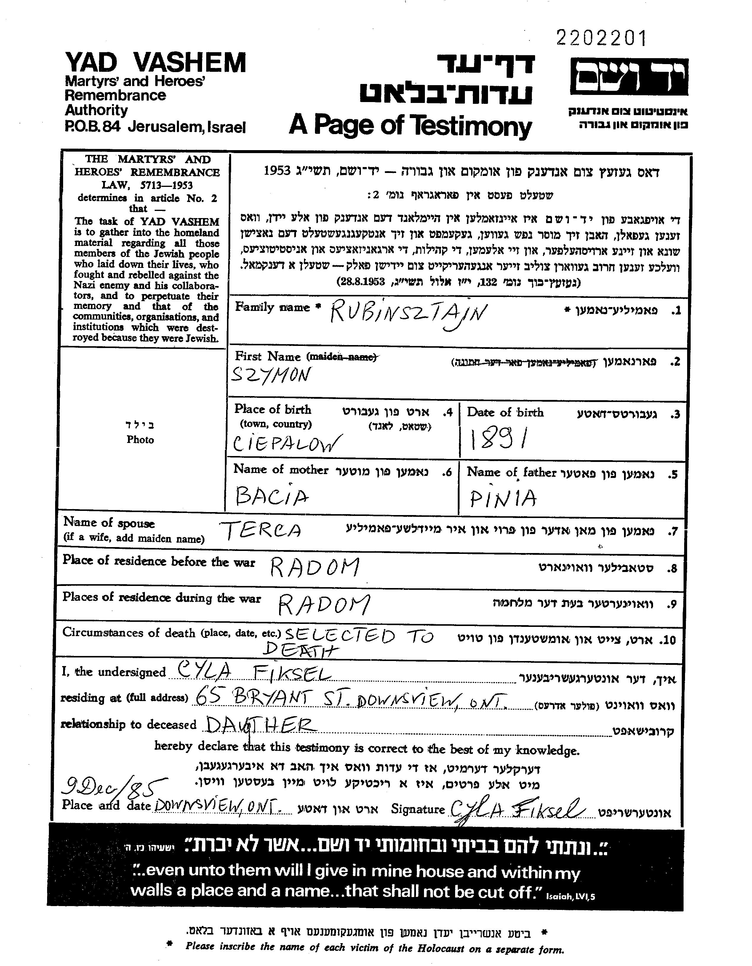 Rubinsztajn Szymon 1891 Radom, Polen Gedenkblatt