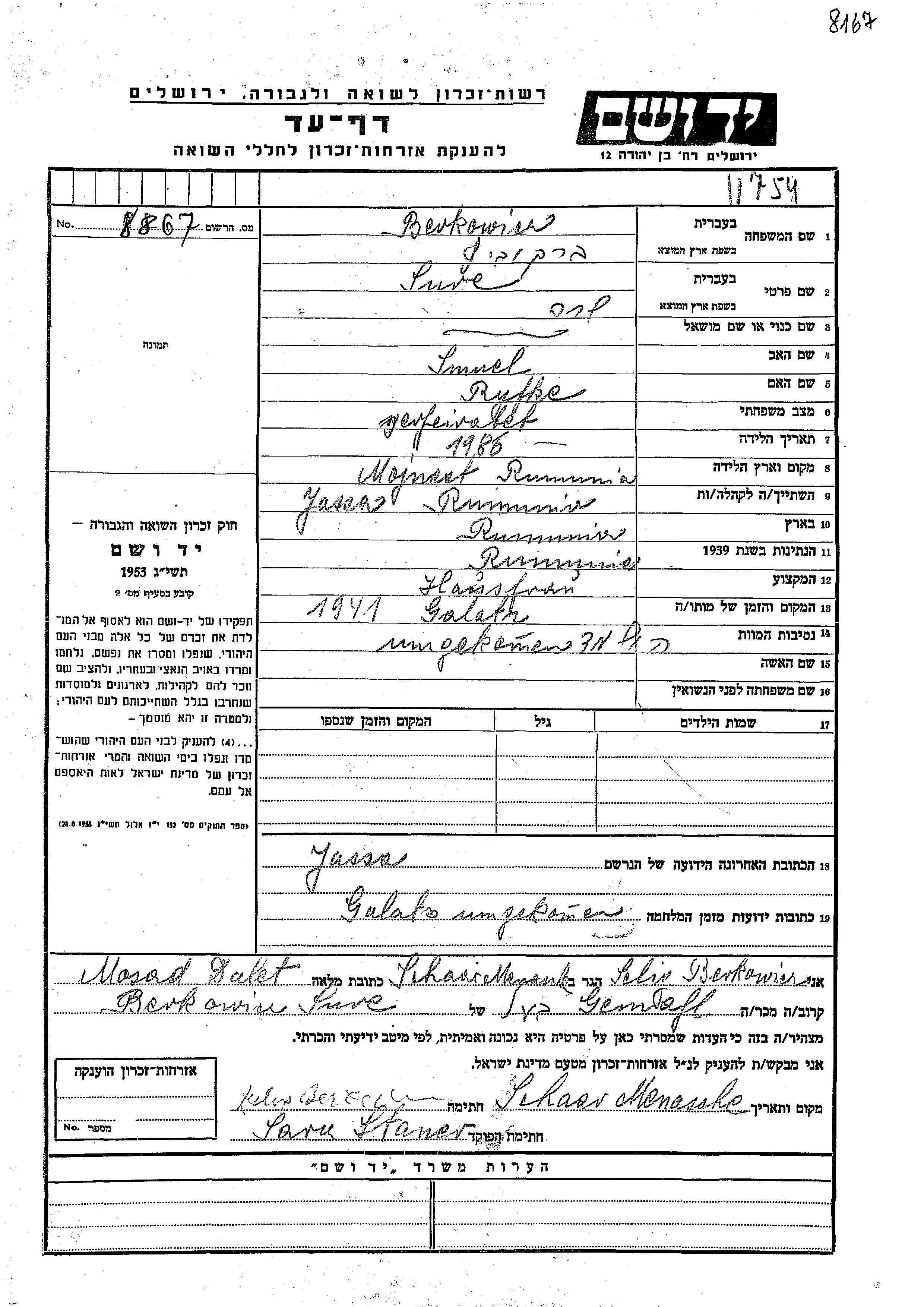 Sure Berkowicz wurde im Jahr 1886 in Moinesti, Rumänien geboren. Sie war die Tochter von Smuel und Ryfke. Sie war Hausfrau und Verheiratet. Vor dem Zweiten Weltkrieg lebte sie in Jassy, Rumänien. Während des Krieges war sie in Galati, Rumänien.