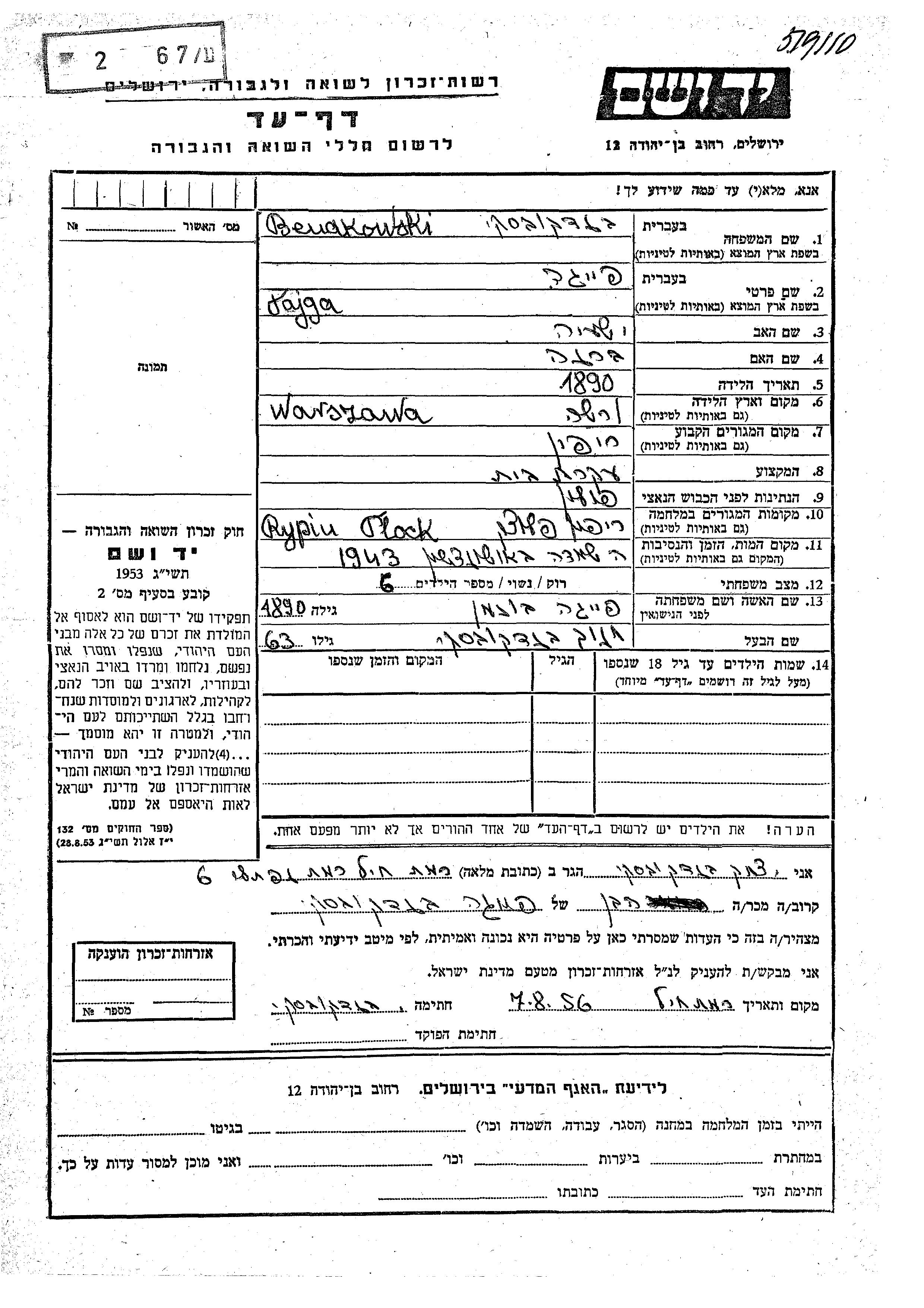 Bendkowski Fajga 1890 Rypin, Polen Gedenkblatt