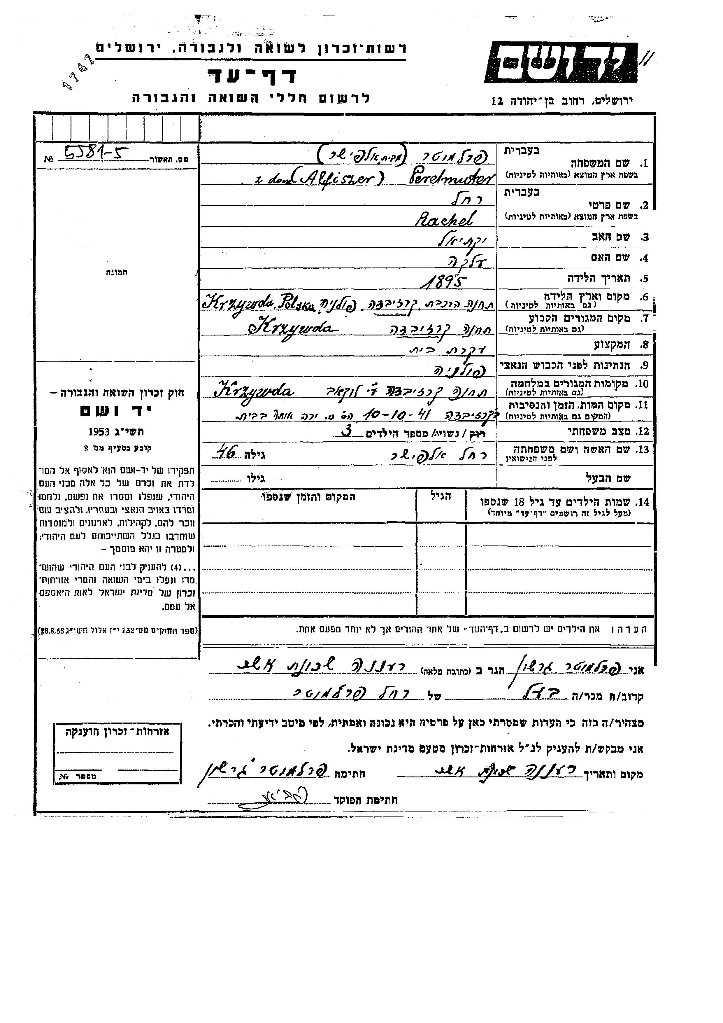 Rachel Perelmuter, geb. Alfiszer wurde im Jahr 1895 in Krzywda, Polen geboren. Sie war die Tochter von Yekutiel und Elka. Sie war Hausfrau und Verheiratet. Vor dem Zweiten Weltkrieg lebte sie in Krzywda, Polen. Während des Krieges war sie in Krzywda, Polen.