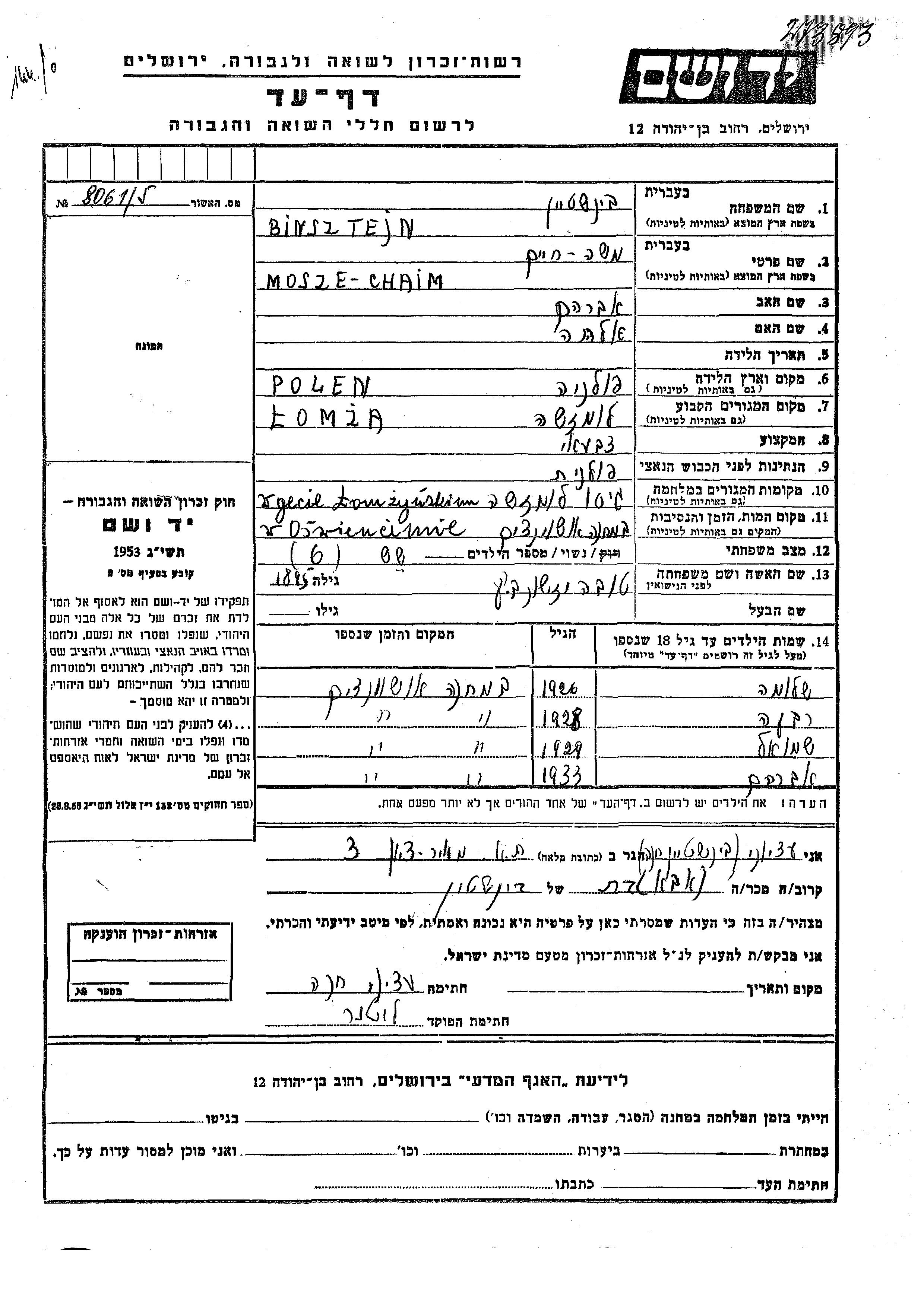 Mosze Chaim Binsztejn wurde in Polen geboren. Er war der Sohn von Avraham und Alte. Er war Anstreicher/-in und mit Tova, geb. Ieshenovitz Verheiratet. Vor dem Zweiten Weltkrieg lebte er in Łomża, Polen. Während des Krieges war er in Łomża, Polen.