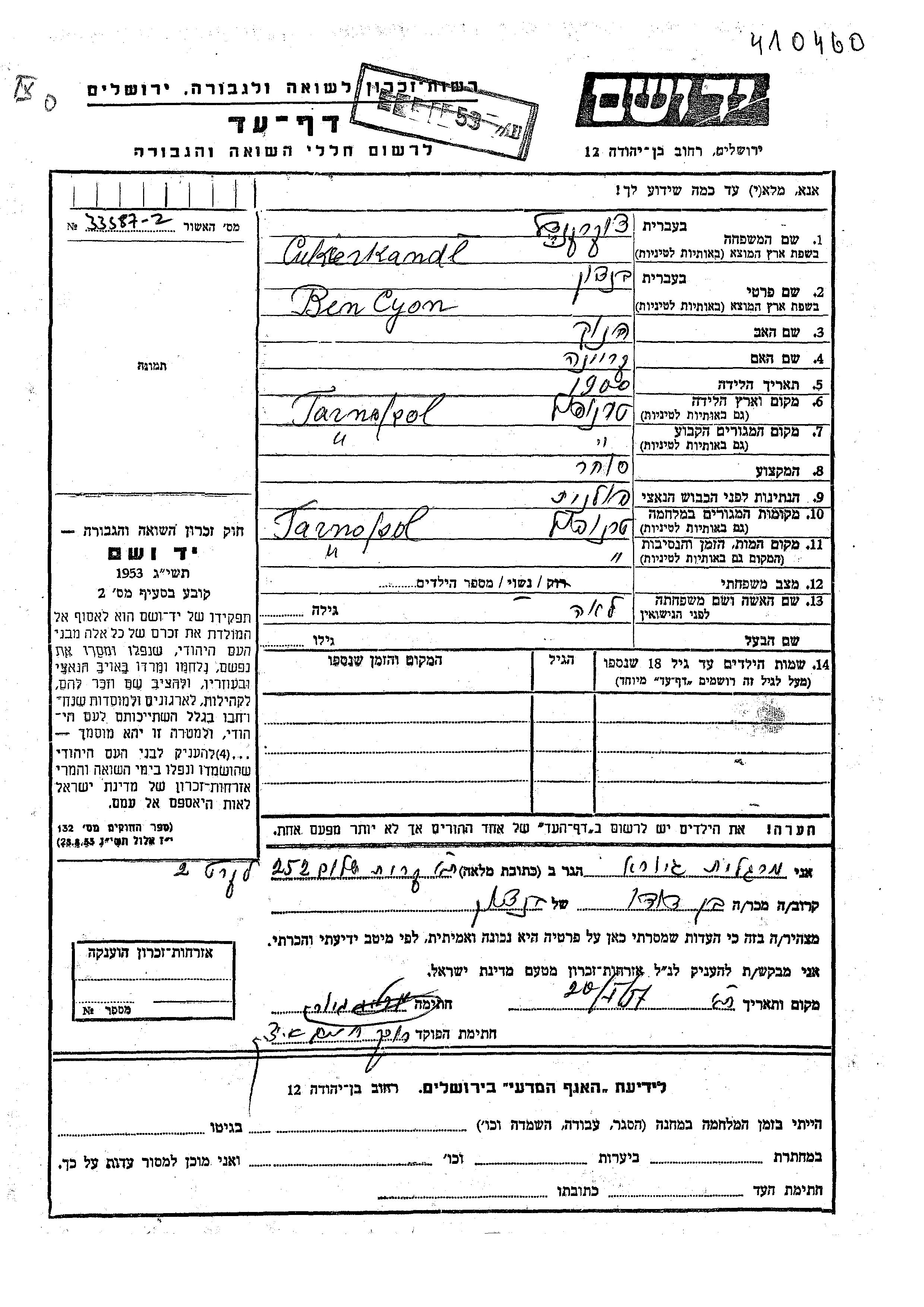 Ben Cyon Cukerkandl wurde im Jahr 1900 in Tarnopol, Polen geboren. Er war der Sohn von Henok und Kreina. Er war Kaufmann/-frau und mit Lea Verheiratet. Vor dem Zweiten Weltkrieg lebte er in Tarnopol, Polen. Während des Krieges war er in Tarnopol, Polen.