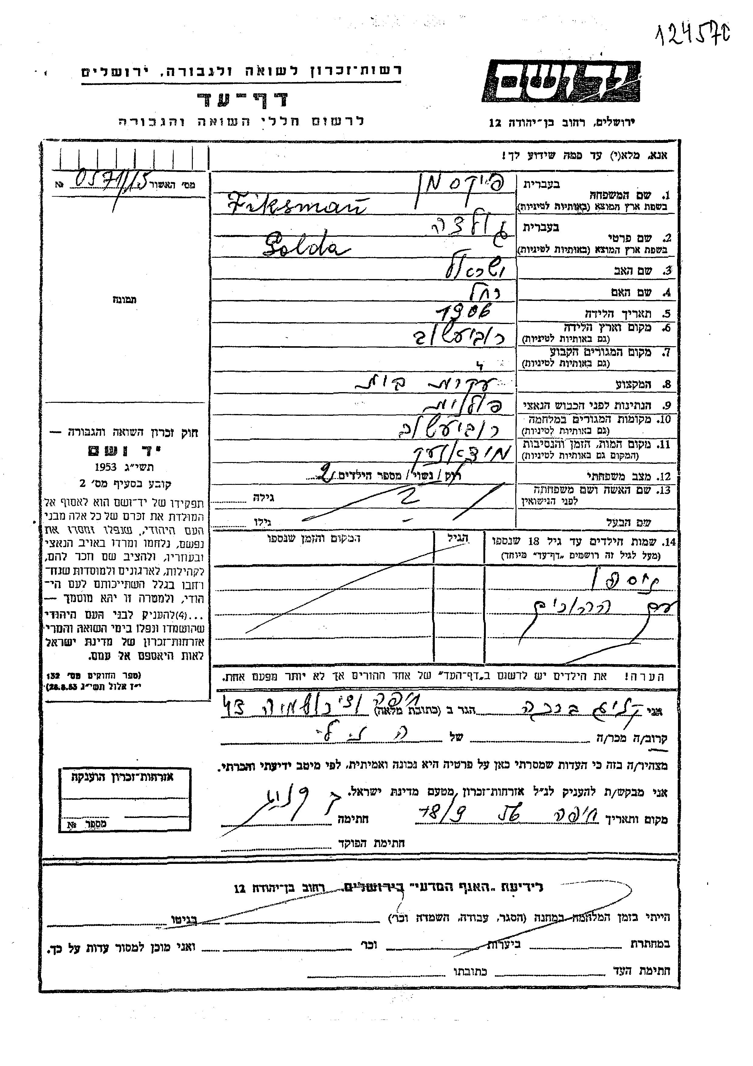 Golda Fiksman wurde im Jahr 1906 in Rubieszow, Polen geboren. Sie war die Tochter von Yisrael und Rakhel. Sie war Hausfrau und Verheiratet. Vor dem Zweiten Weltkrieg lebte sie in Rubieszow, Polen. Während des Krieges war sie in Rubieszow, Polen.