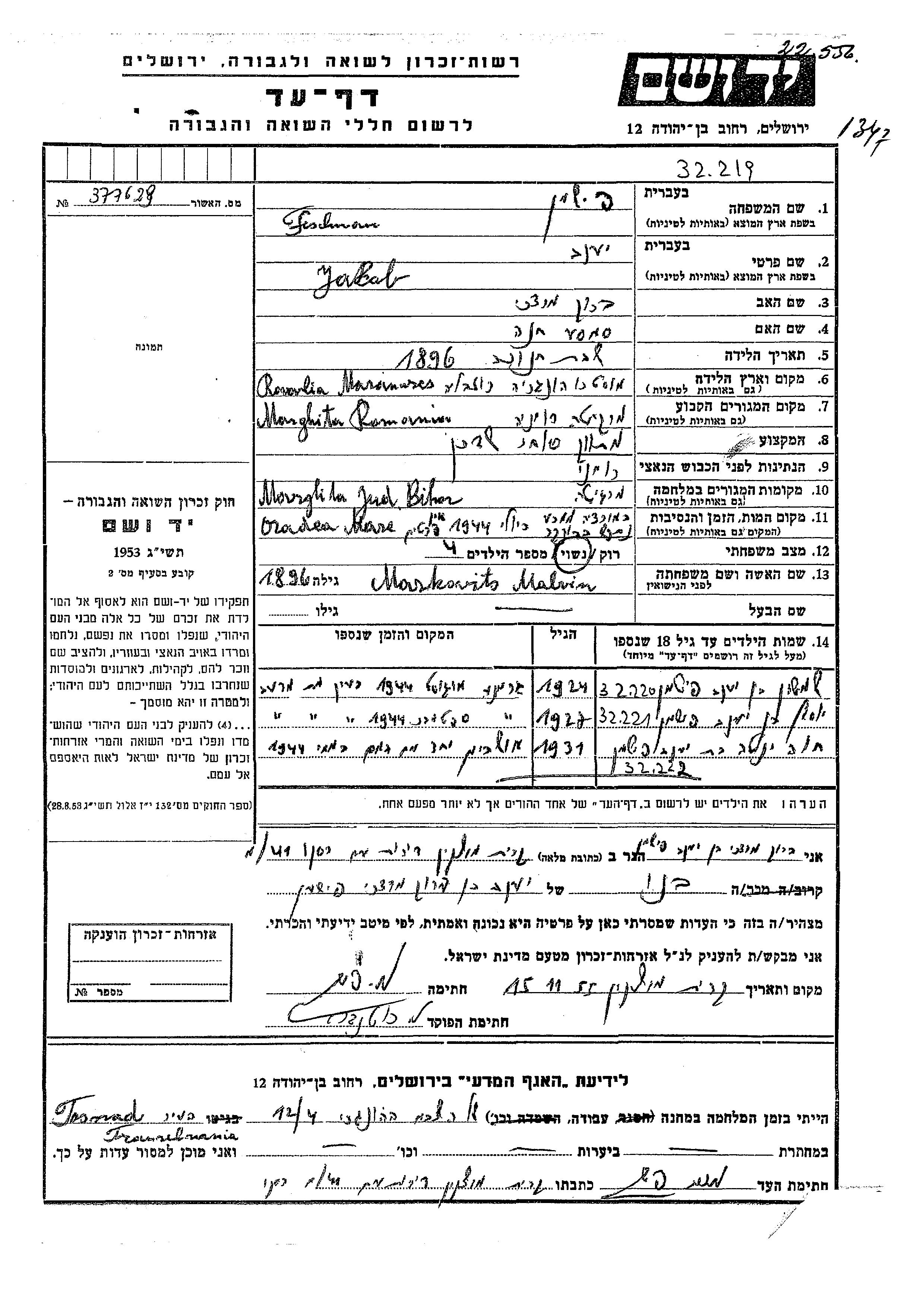Fischman Jakab 1896 Marghita, Rumänien Gedenkblatt