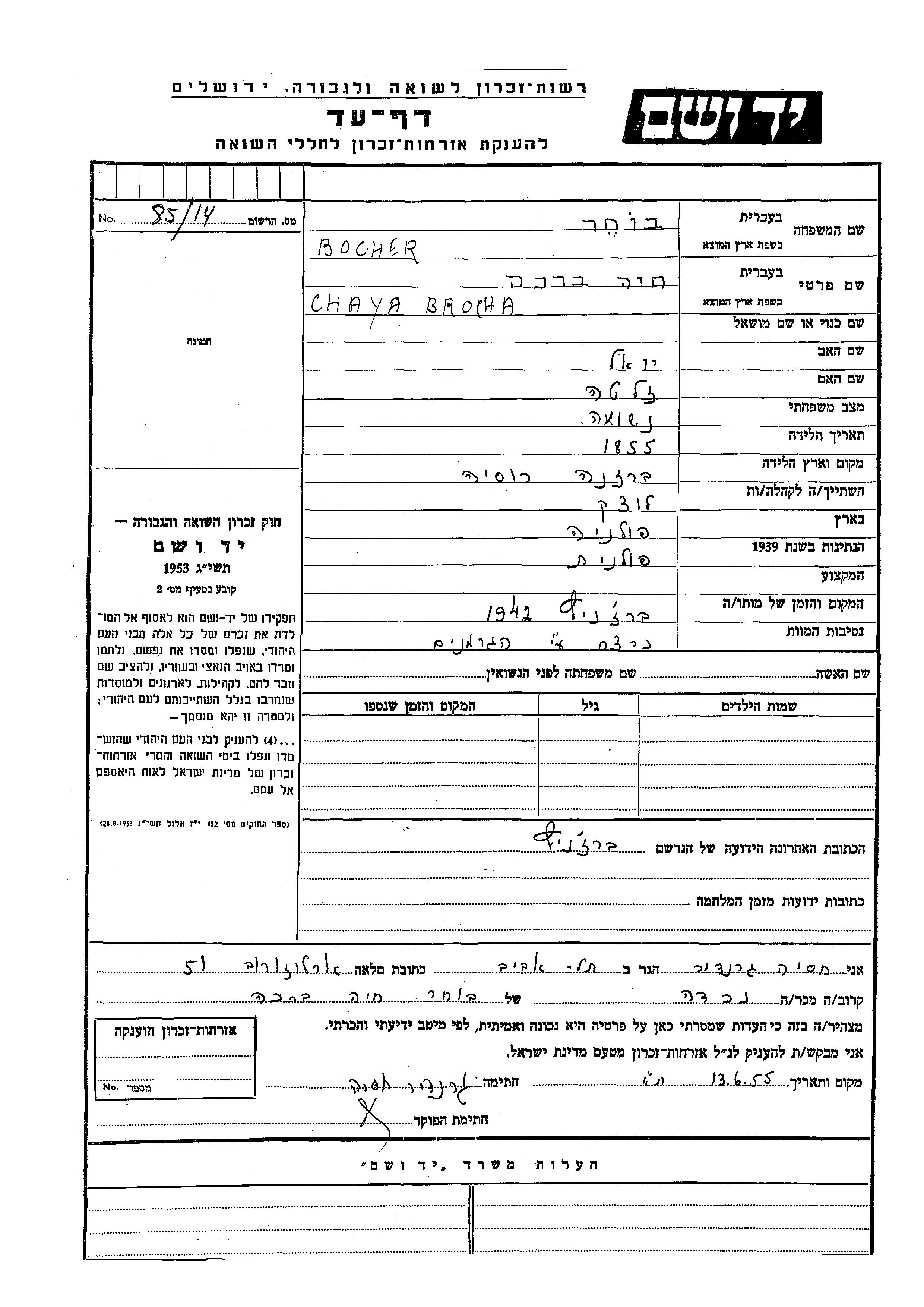 Chaya Brocha wurde in der Schoah ermordet. Todesort: Bereznica, Polen im Jahr 1942.