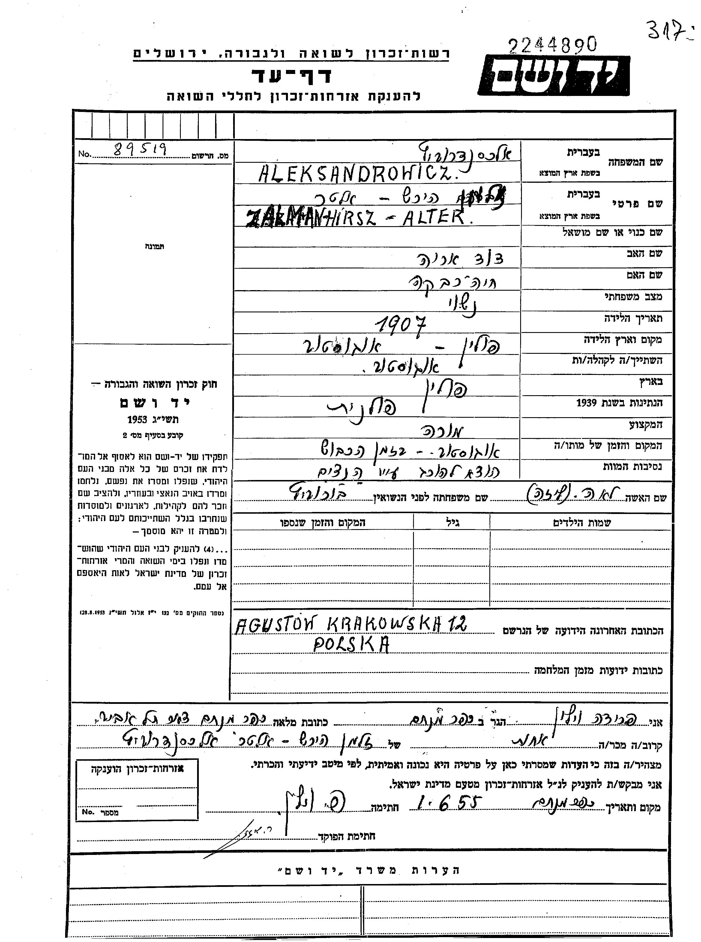 Aleksandrowicz Zalman Hirsz Alter 1907 Augustów, Polen Gedenkblatt