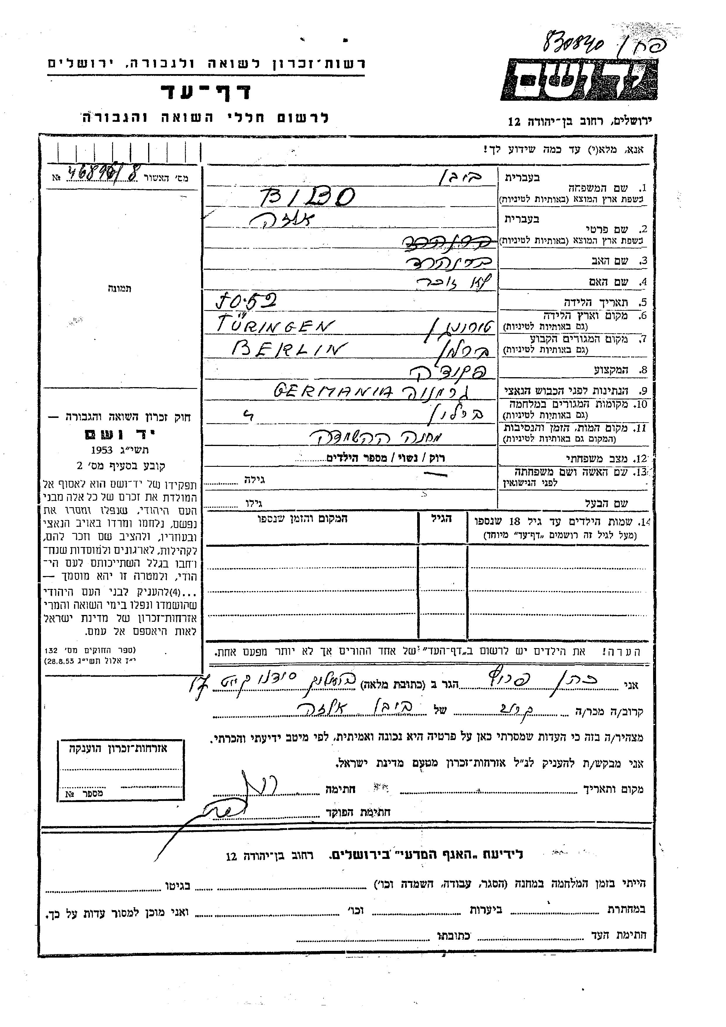 Elza Bebi wurde in Thueringen, Deutsches Reich geboren. Sie war die Tochter von Bernhard. Sie war Angestellte/-r und Ledig. Vor dem Zweiten Weltkrieg lebte sie in Berlin, Deutsches Reich. Während des Krieges war sie in Berlin, Deutsches Reich.