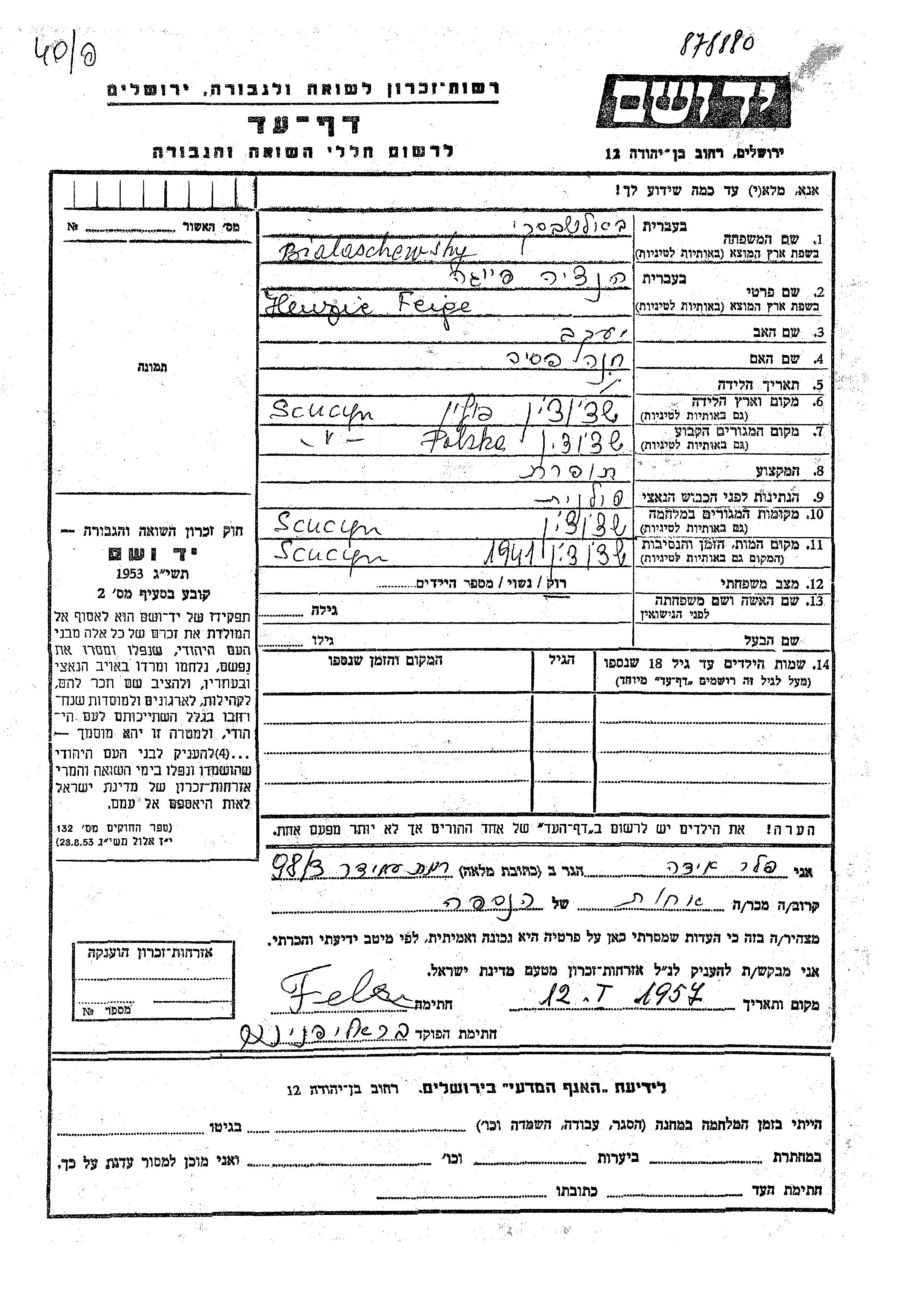 Henzie Feiga Bialaschewsky wurde in Szczuczyn, Polen geboren. Sie war die Tochter von Yaakov und Khana Pesia. Sie war Schneiderin und Ledig. Vor dem Zweiten Weltkrieg lebte sie in Szczuczyn, Polen. Während des Krieges war sie in Szczuczyn, Polen.