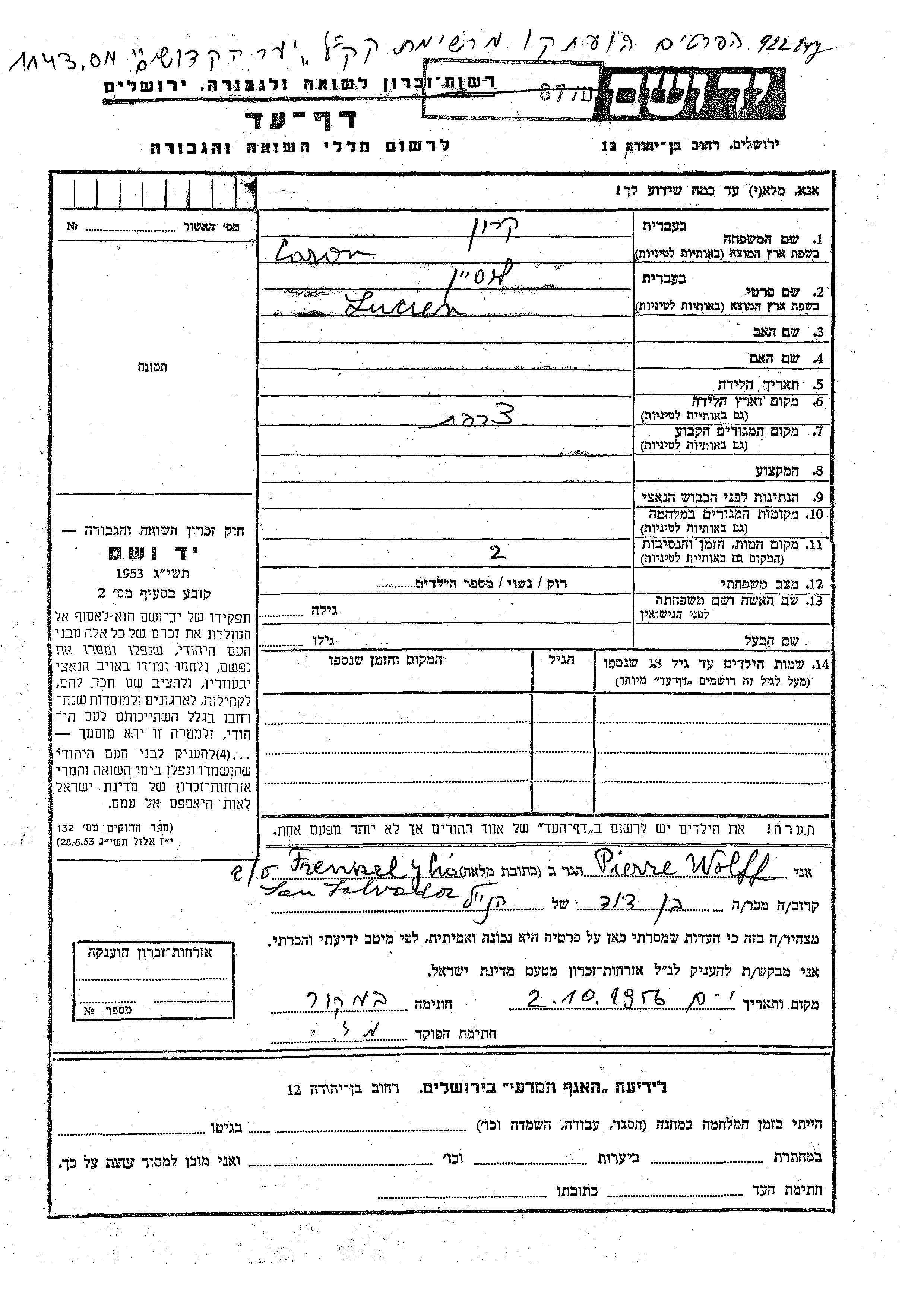 Caron Kron Lucien unbekannter Ort, Gedenkblatt