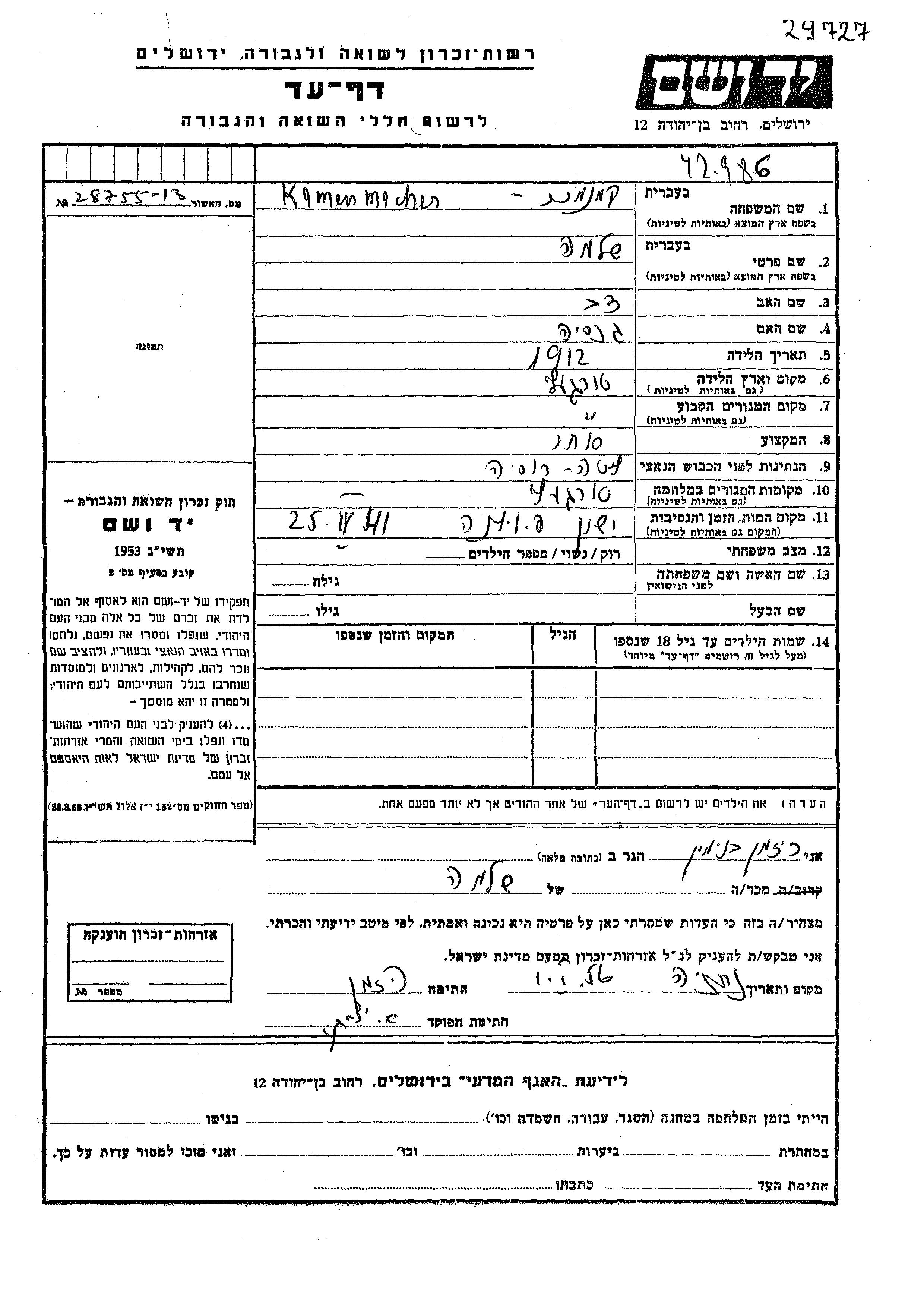Kamenmacher Shlomo 1912 Turgiele, Polen Gedenkblatt