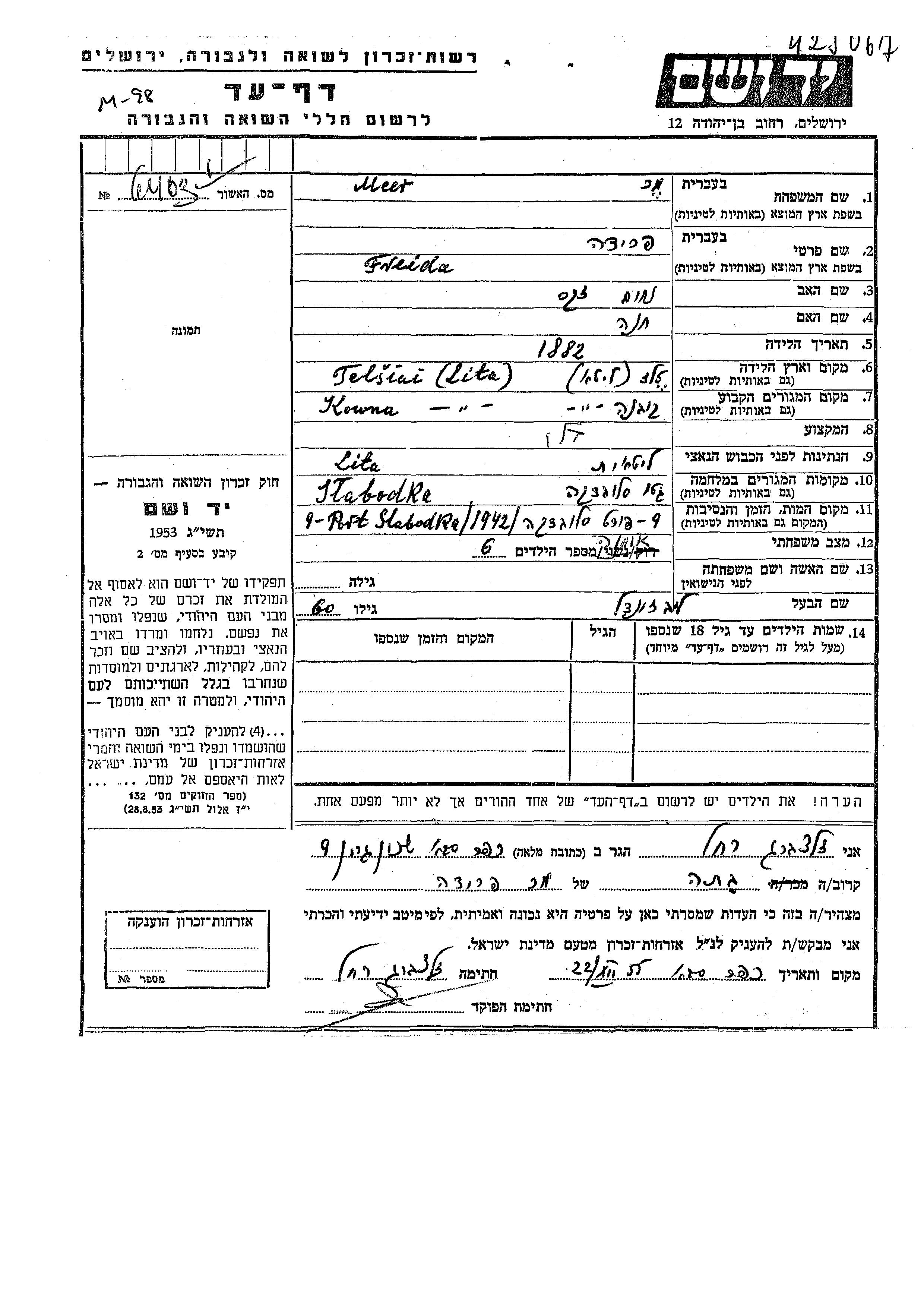 Freida Frida Meer Mer, geb. Zaks wurde im Jahr 1882 in Telsiai, Litauen geboren. Sie war die Tochter von Nakhum Zhaks und Khana. Sie war Ohne beruf und mit Leib Zindel Witwe. Vor dem Zweiten Weltkrieg lebte sie in Kowna, Litauen. Während des Krieges war sie in Slobodka, Litauen.