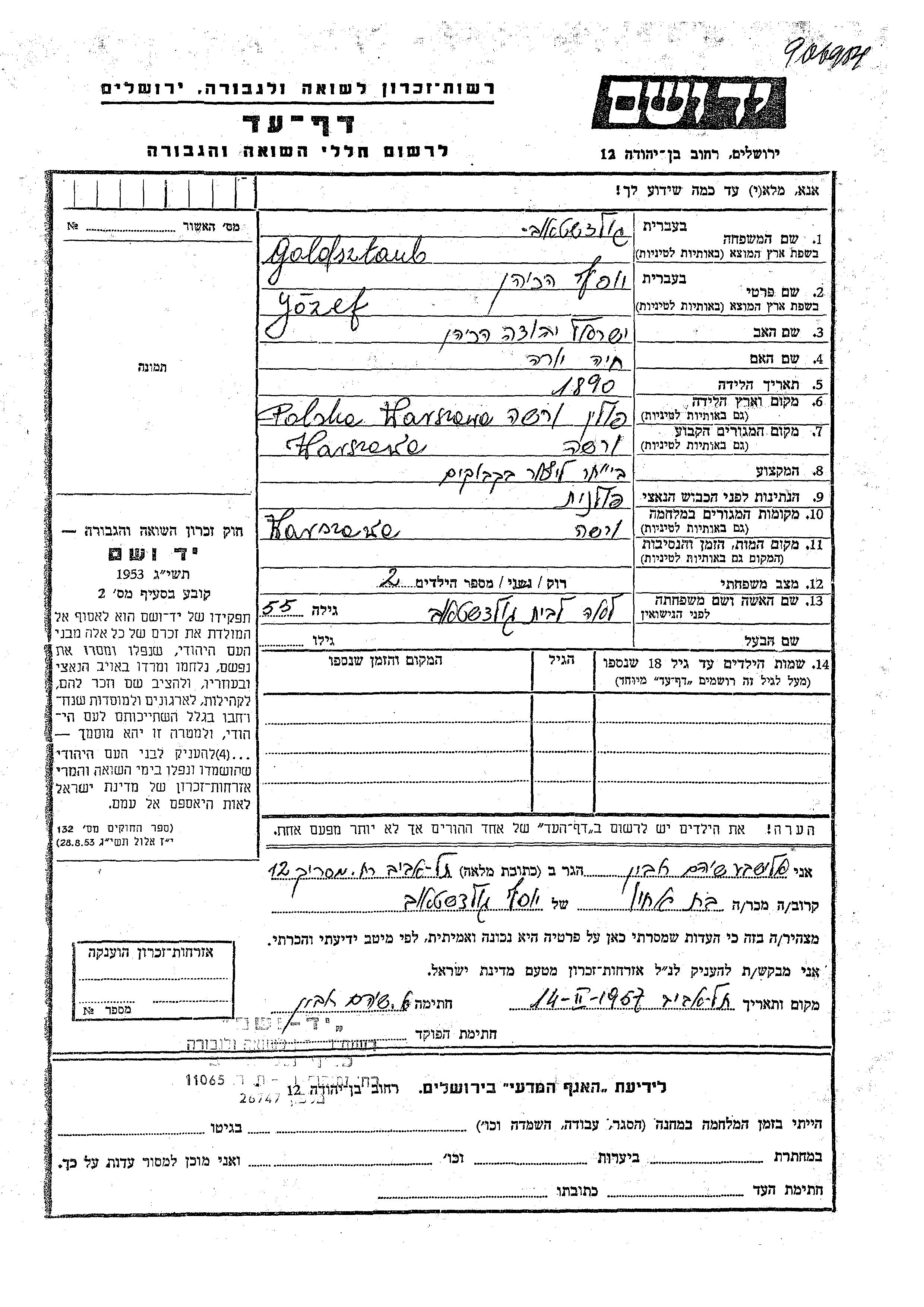 Yozef Goldsztaub Hacohen wurde im Jahr 1890 in Warsaw, Polen geboren. Er war der Sohn von Yisrael Yehuda und Khaia Yura. Er war בית חרושת לייצור בקבוקים und mit Lea Verheiratet. Vor dem Zweiten Weltkrieg lebte er in Warsaw, Polen. Während des Krieges war er in Warsaw, Polen.
