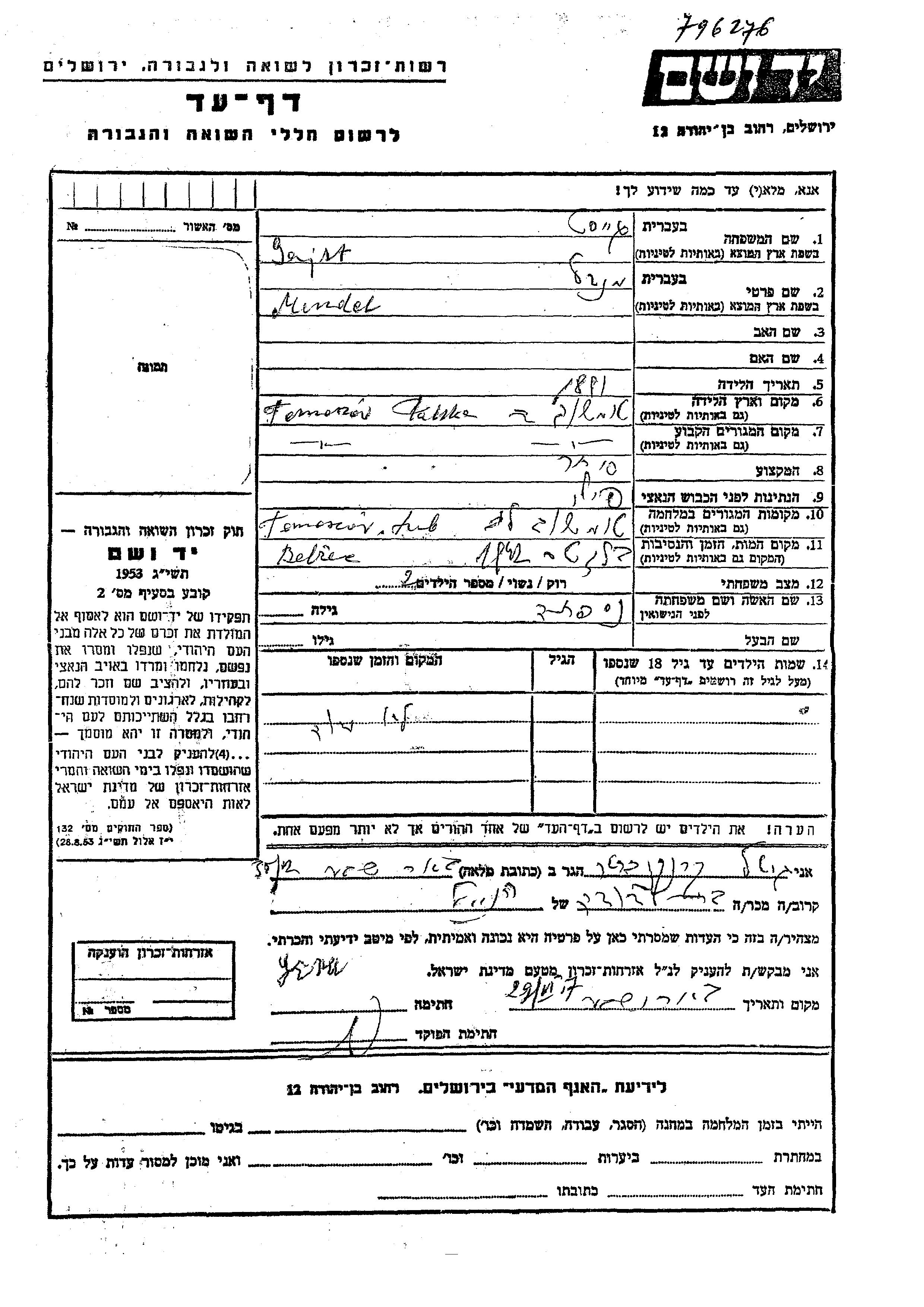 Mendel wurde in der Schoah ermordet. Todesort: Belzec, Polen im Jahr 1942.