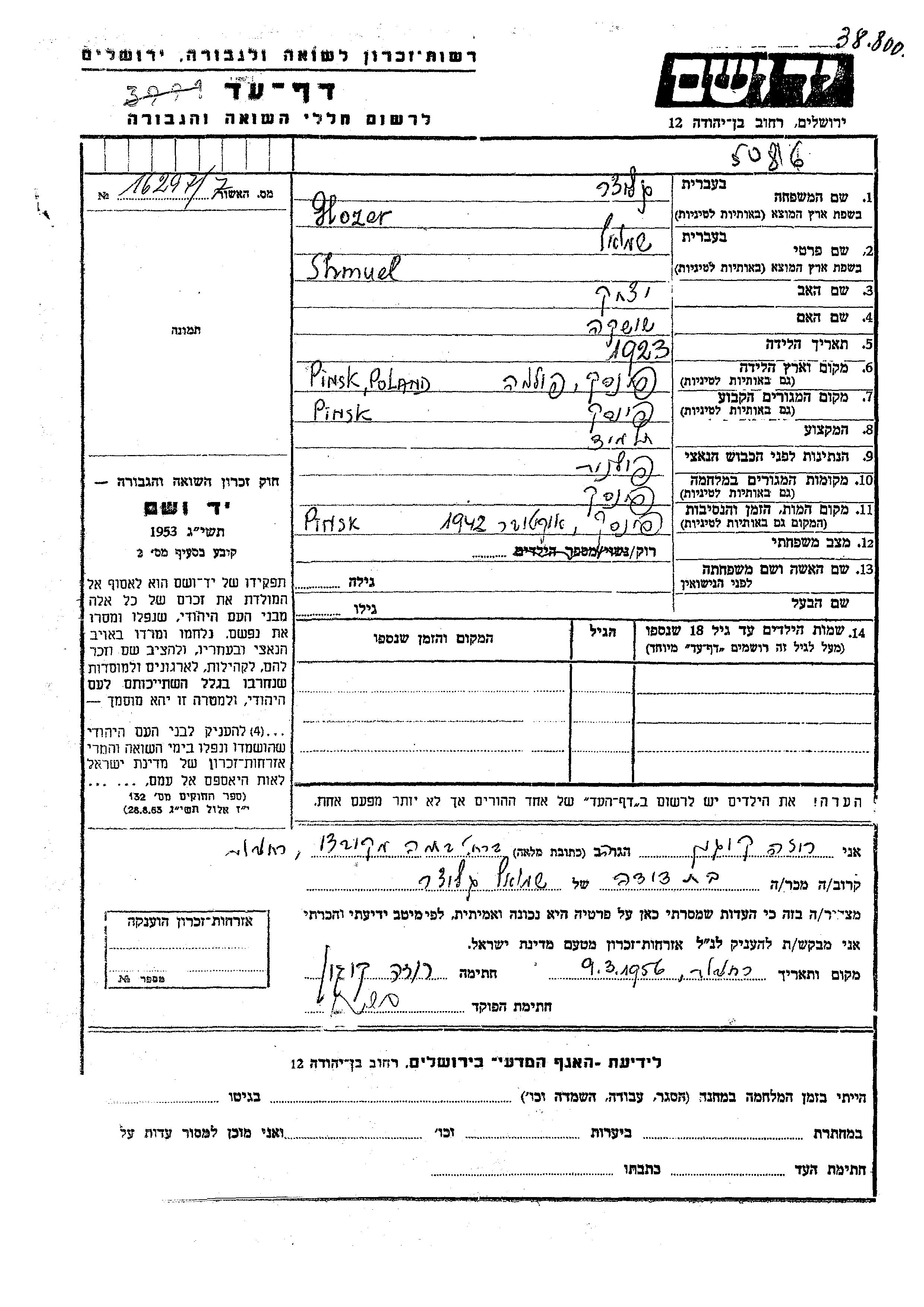 Glozer Shmuel 1923 Pinsk, Polen Gedenkblatt