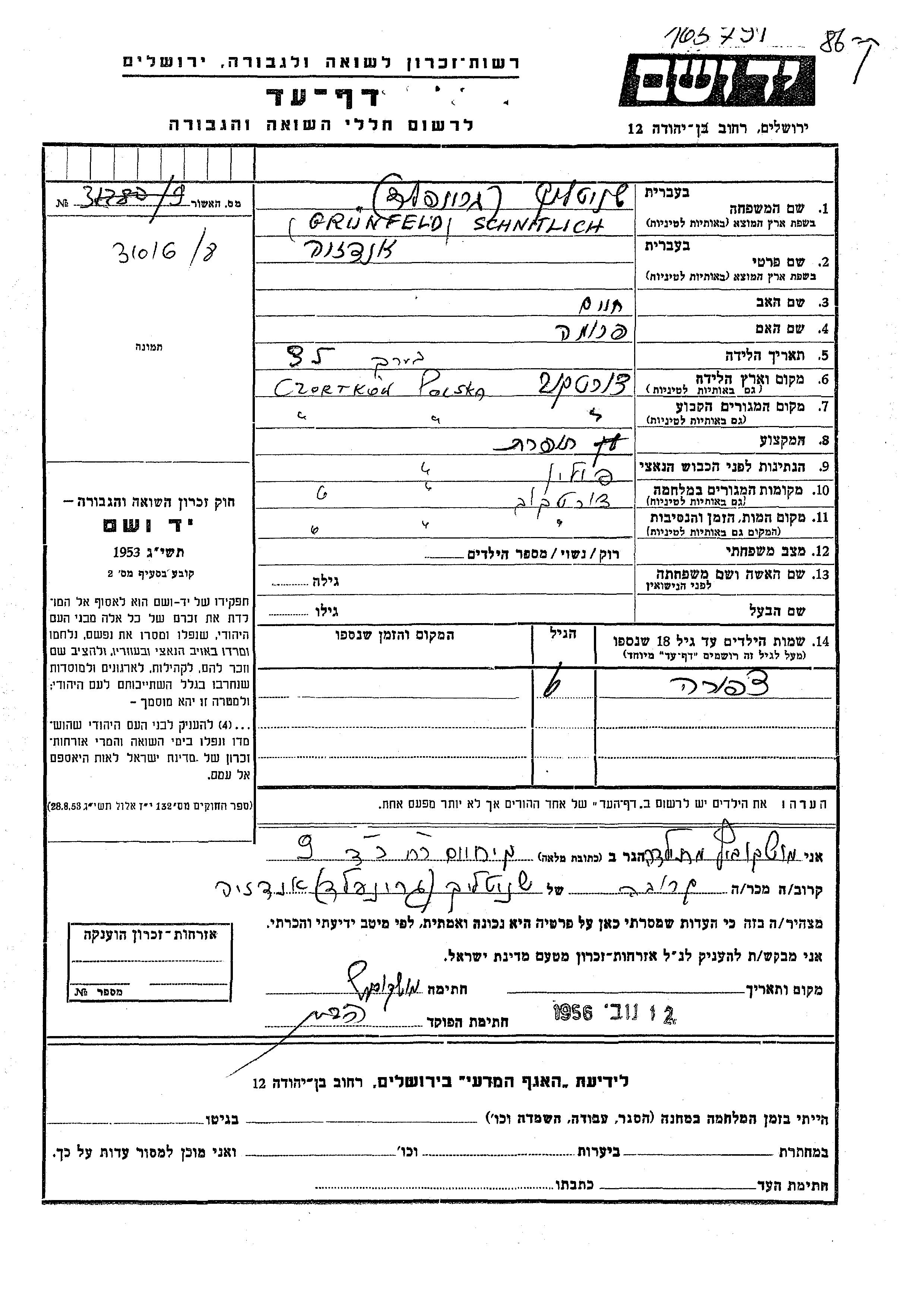 Andzia Schnitlich, geb. Grunfeld wurde in Czortkow, Polen geboren. Sie war die Tochter von Khaim und Fruma. Sie war Schneiderin. Vor dem Zweiten Weltkrieg lebte sie in Czortkow, Polen. Während des Krieges war sie in Czortkow, Polen.