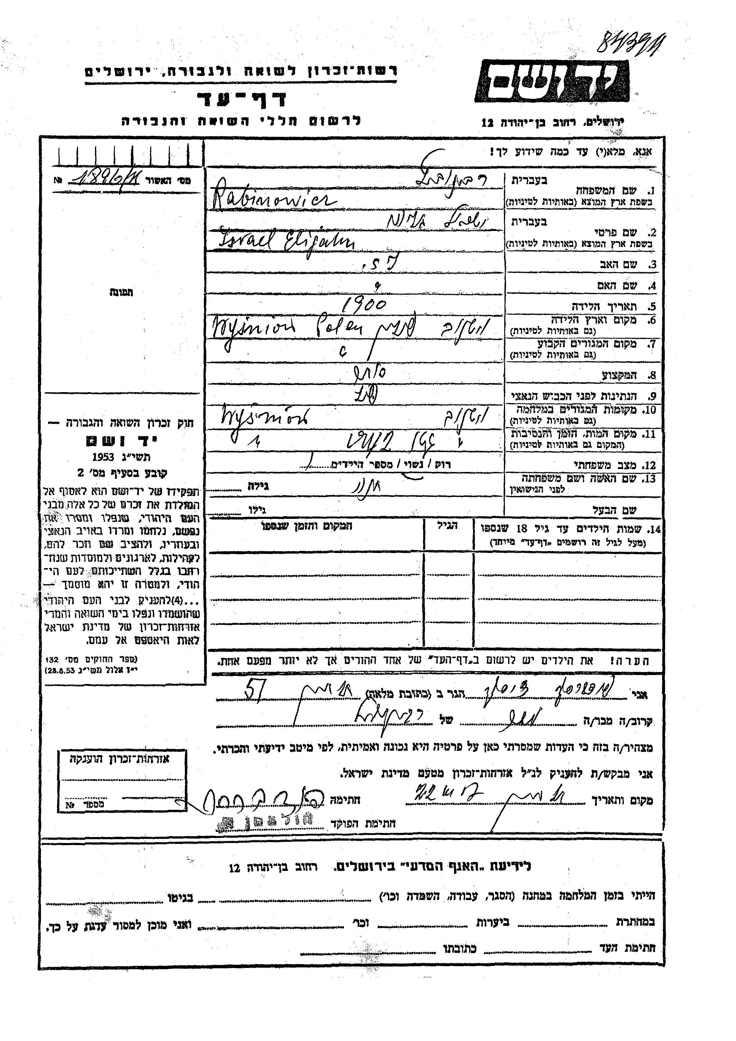 Ysrael Elijahu Rabinowicz wurde im Jahr 1900 in Wiszniew, Polen geboren. Er war Kaufmann/-frau und mit Khana Verheiratet. Vor dem Zweiten Weltkrieg lebte er in Wiszniew, Polen. Während des Krieges war er in Wiszniew, Polen.