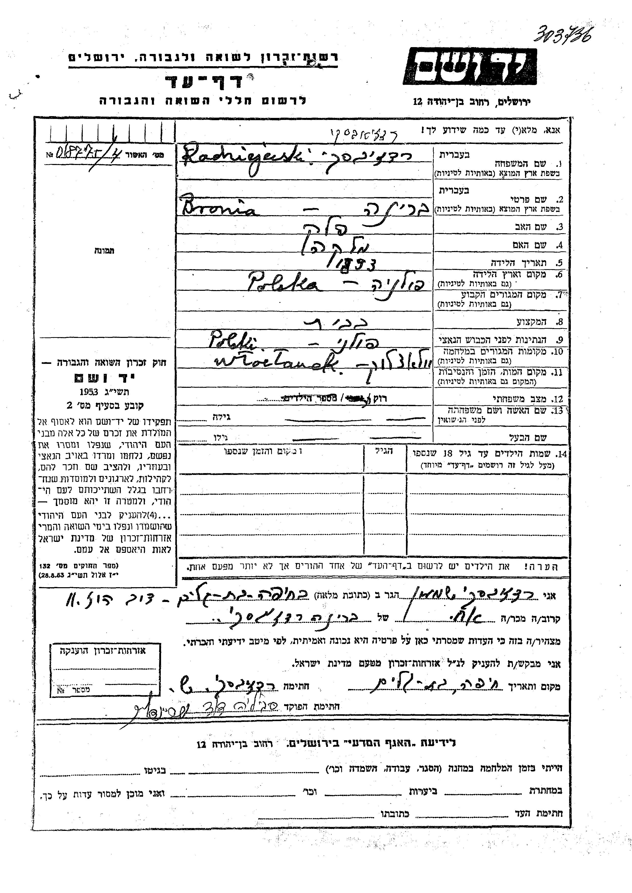 Bronia Radziejewski Radzivski wurde im Jahr 1893 in Polen geboren. Sie war die Tochter von Falk und Malka. Sie war Hausfrau und Ledig. Während des Krieges war sie in Wloclawek, Polen.