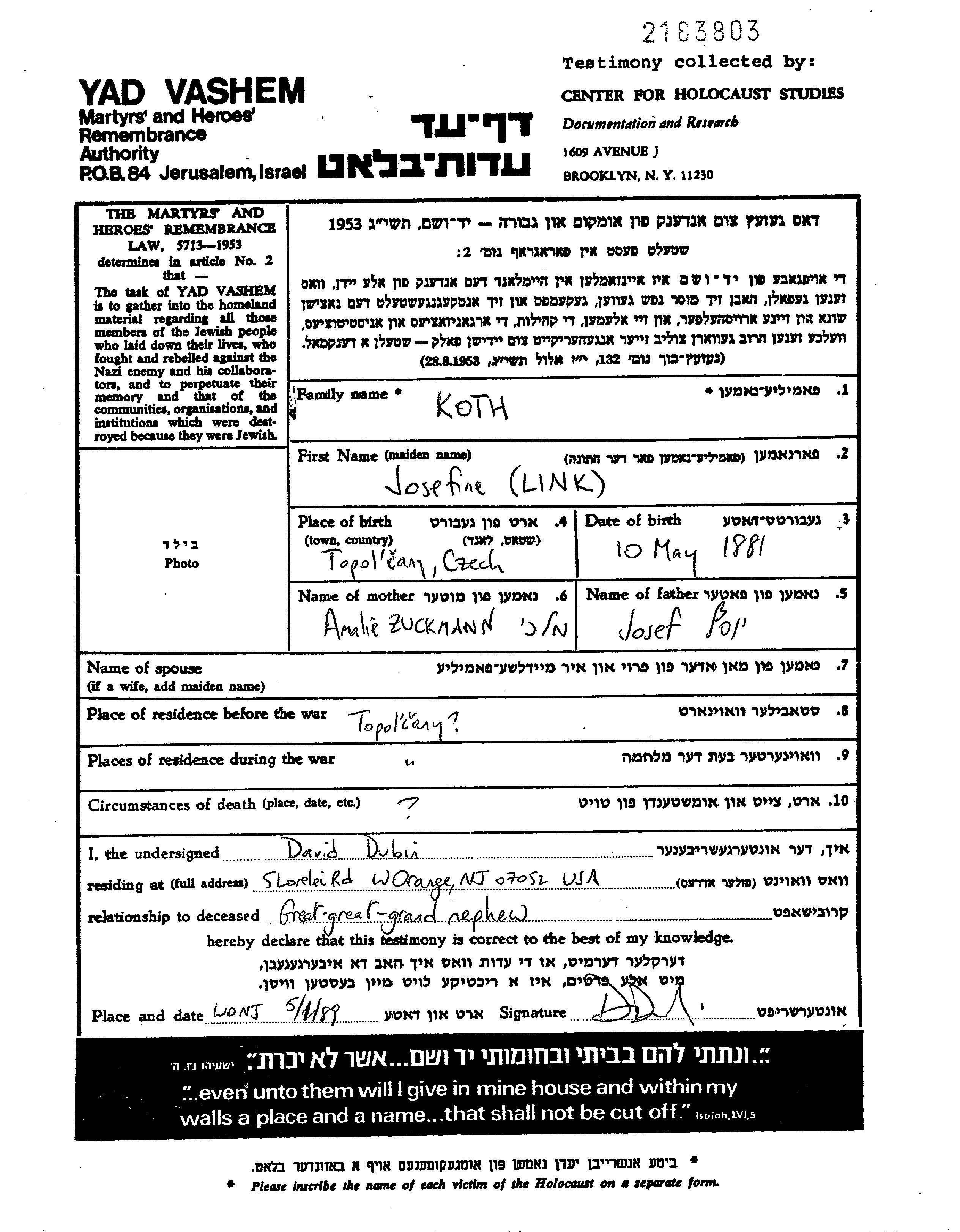Koth Josefine Lina 1881 Topolcany, Tschechoslowakei Gedenkblatt