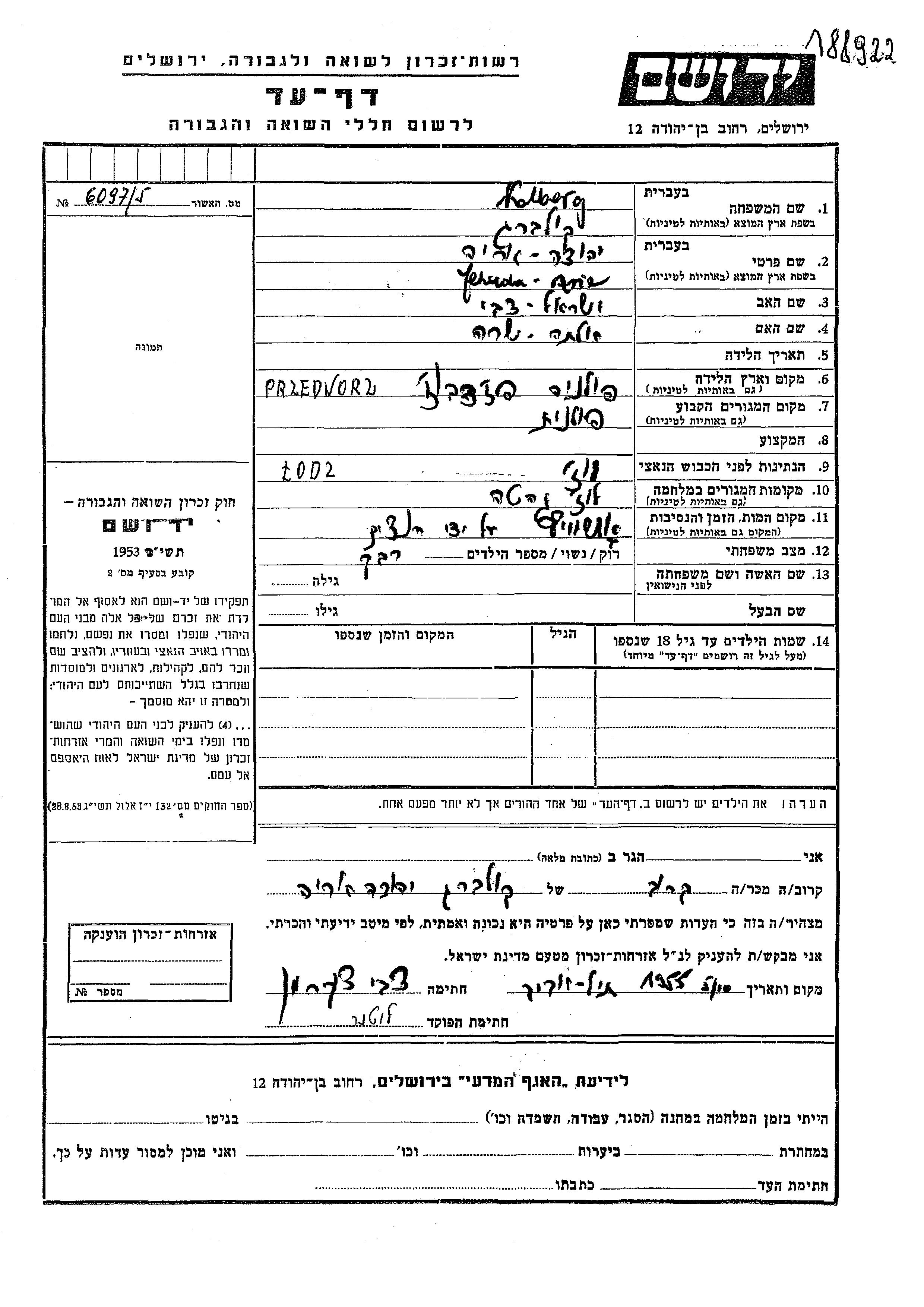 Yehuda Arie Kolberg wurde in Przedworz, Polen geboren. Er war der Sohn von Yisrael Tzvi und Ester Sara. Er war Ledig. Während des Krieges war er in Lodz, Polen.