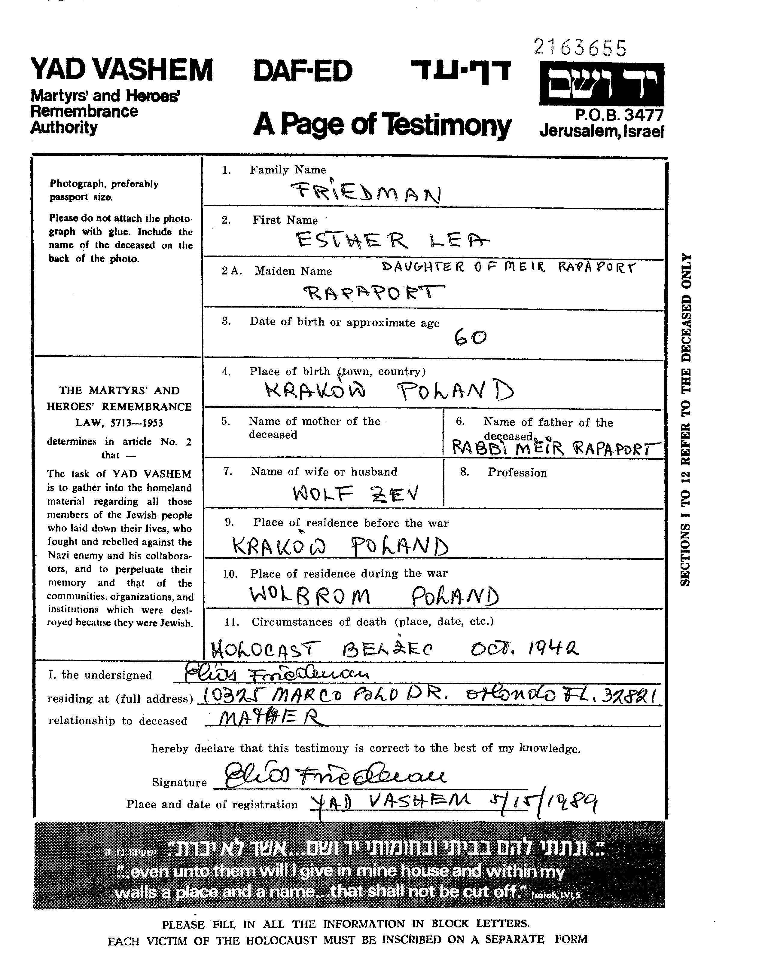 Esther Friedman, geb. Rapaport wurde im Jahr 1878 in Krakow, Polen geboren. Sie war Hausfrau. Vor dem Zweiten Weltkrieg lebte sie in Krakow, Polen.