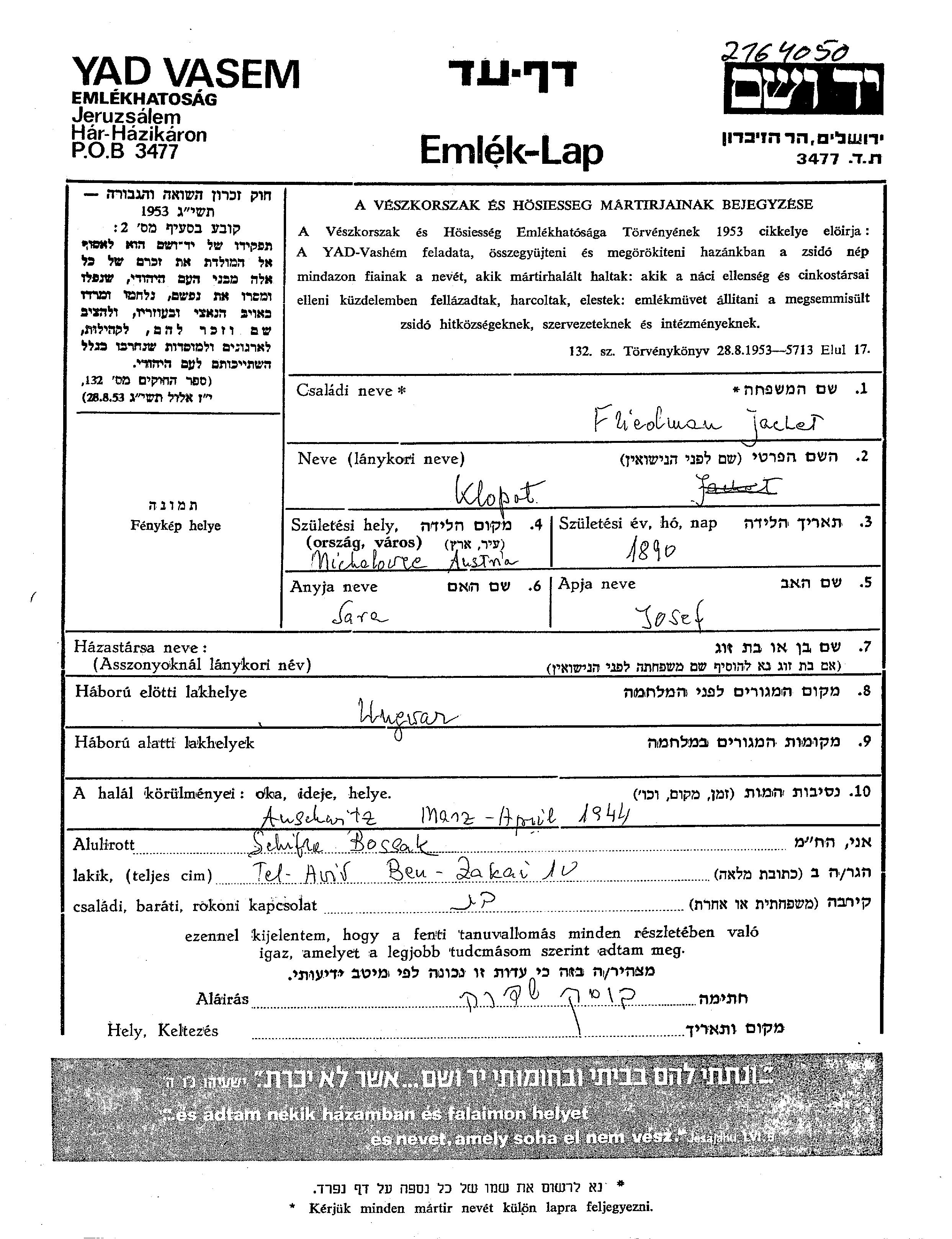 Yochewed Friedman, geb. Klopot wurde im Jahr 1890 in Michalovce, Tschechoslowakei geboren. Sie war Hausfrau. Vor dem Zweiten Weltkrieg lebte sie in Uzhorod, Tschechoslowakei.