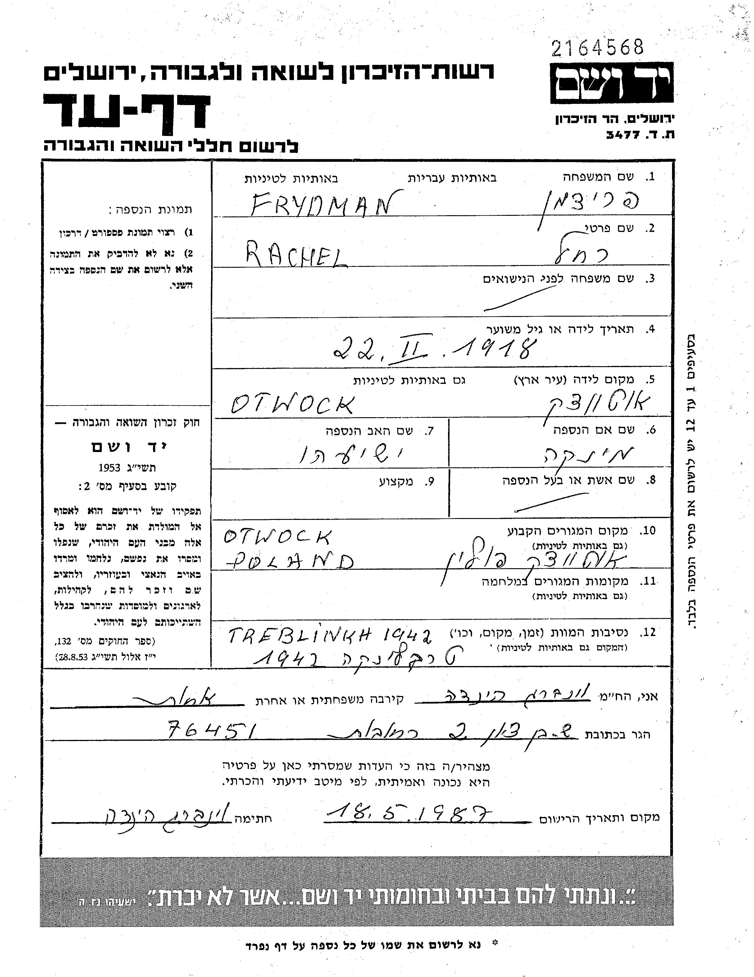 Frydman Rachel 1918 Otwock, Polen Gedenkblatt