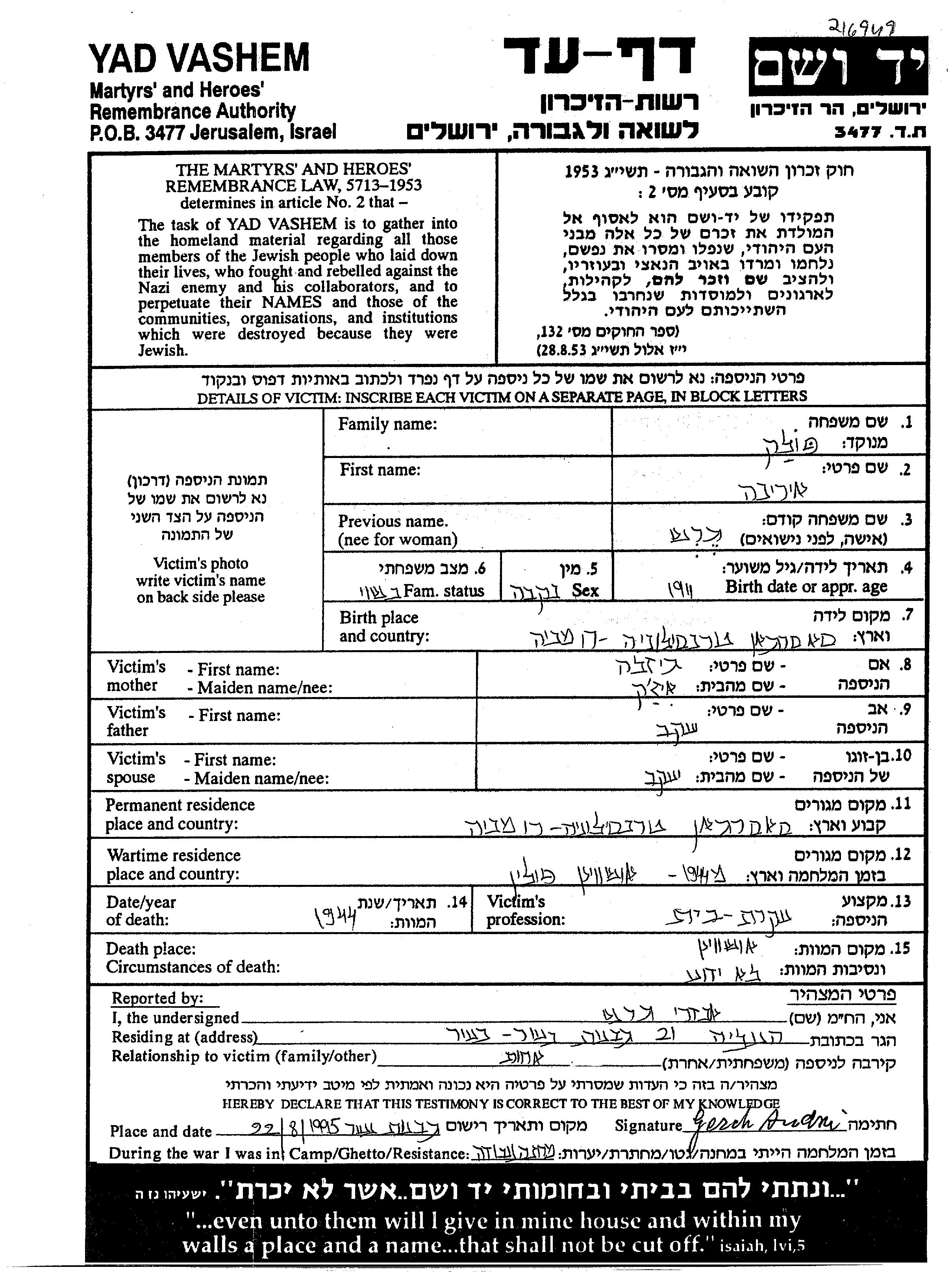 Iren Sara Polak, geb. Gersh wurde im Jahr 1911 in Szaszregen, Rumänien geboren. Sie war Hausfrau. Vor dem Zweiten Weltkrieg lebte sie in Szaszregen, Rumänien.