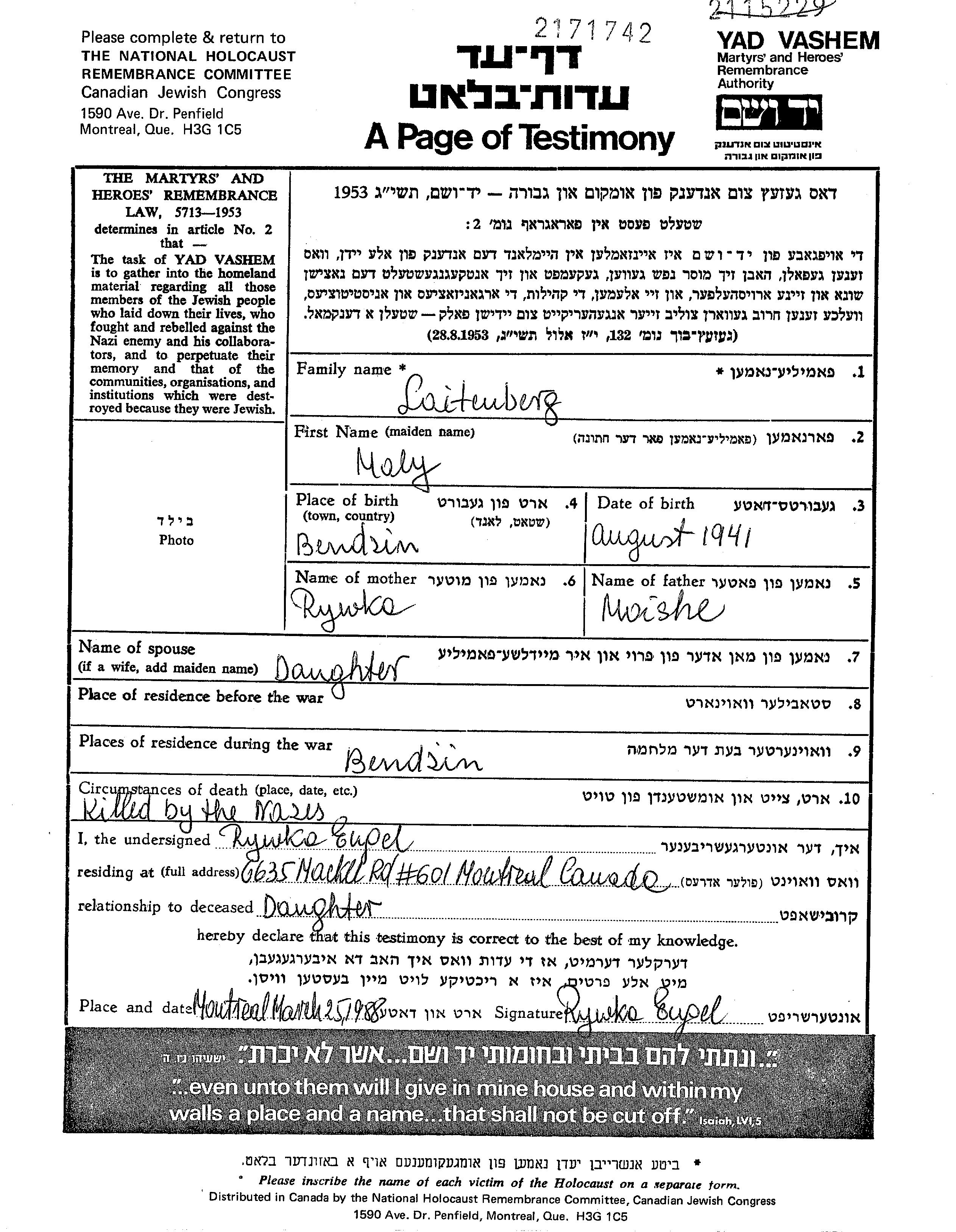 Maly Lajtenberg wurde im Jahr 1941 in Będzin, Polen geboren.