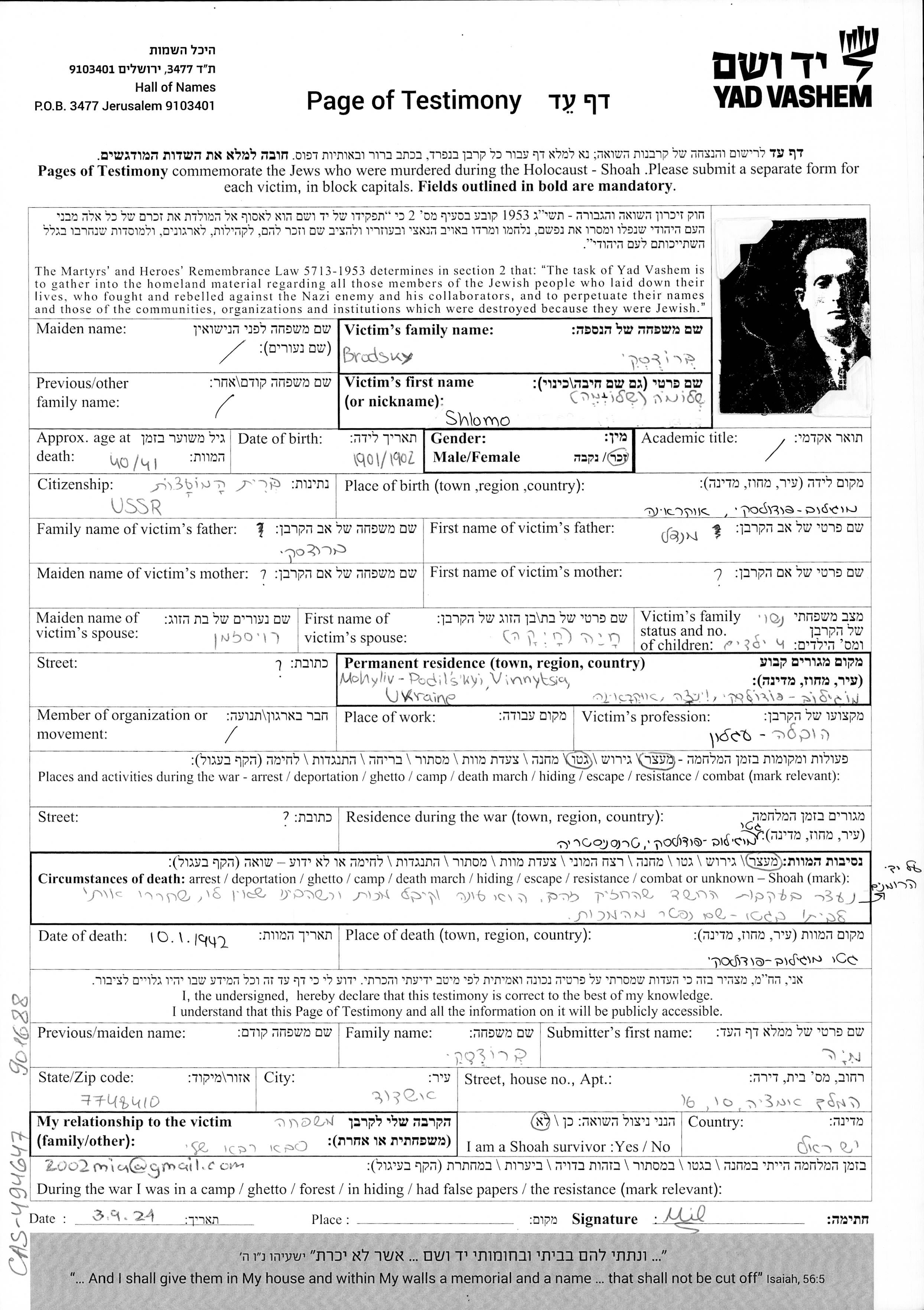 Brotzki | Shlomo | 1901 | Mogilev Podolskiy, Ukraine (UdSSR) | Gedenkblatt |