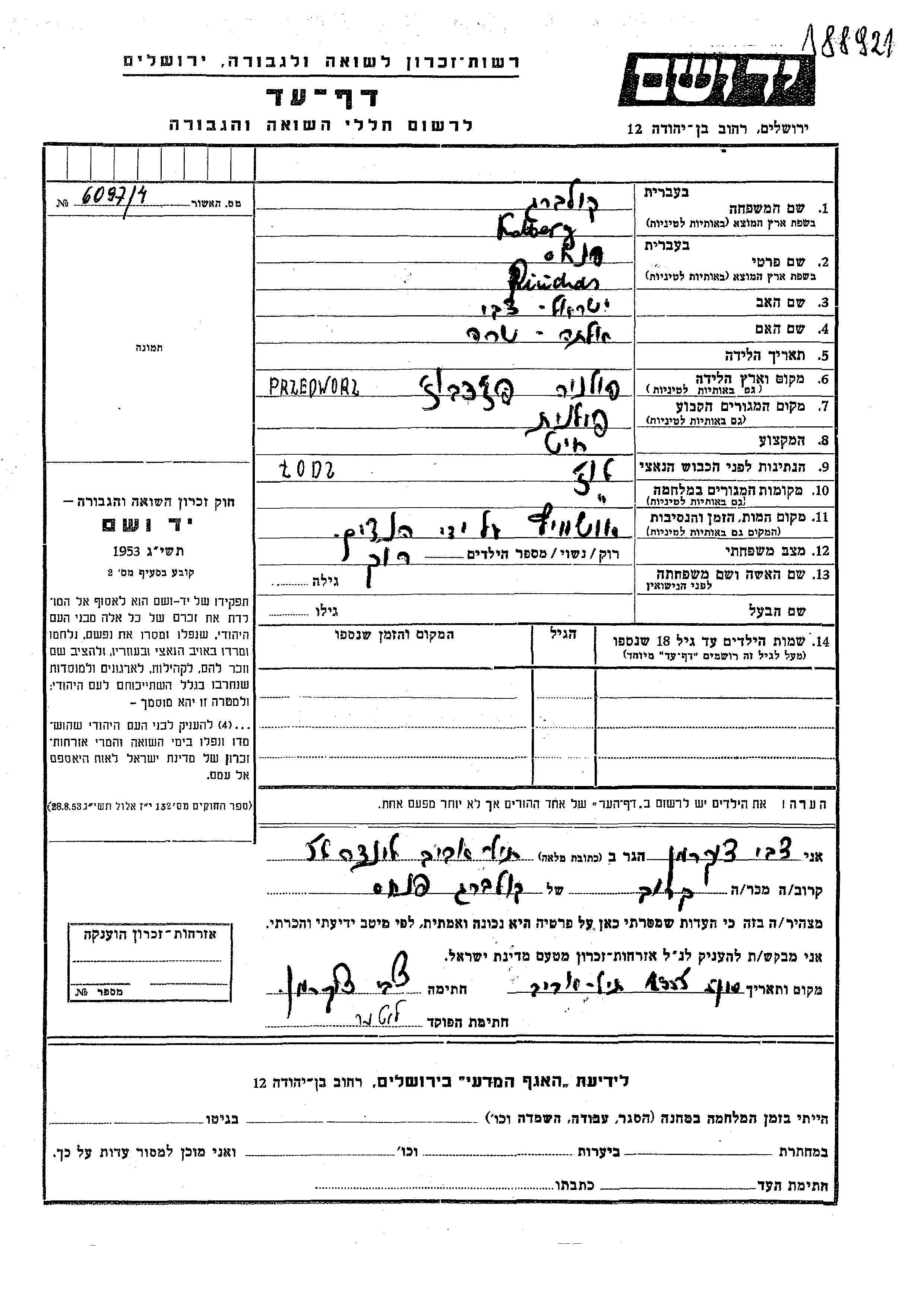 Pinchas Kolberg wurde in Przedworz, Polen geboren. Er war der Sohn von Yisrael Tzvi und Alte Sara. Er war Schneider und Ledig. Vor dem Zweiten Weltkrieg lebte er in Lodz, Polen. Während des Krieges war er in Lodz, Polen.