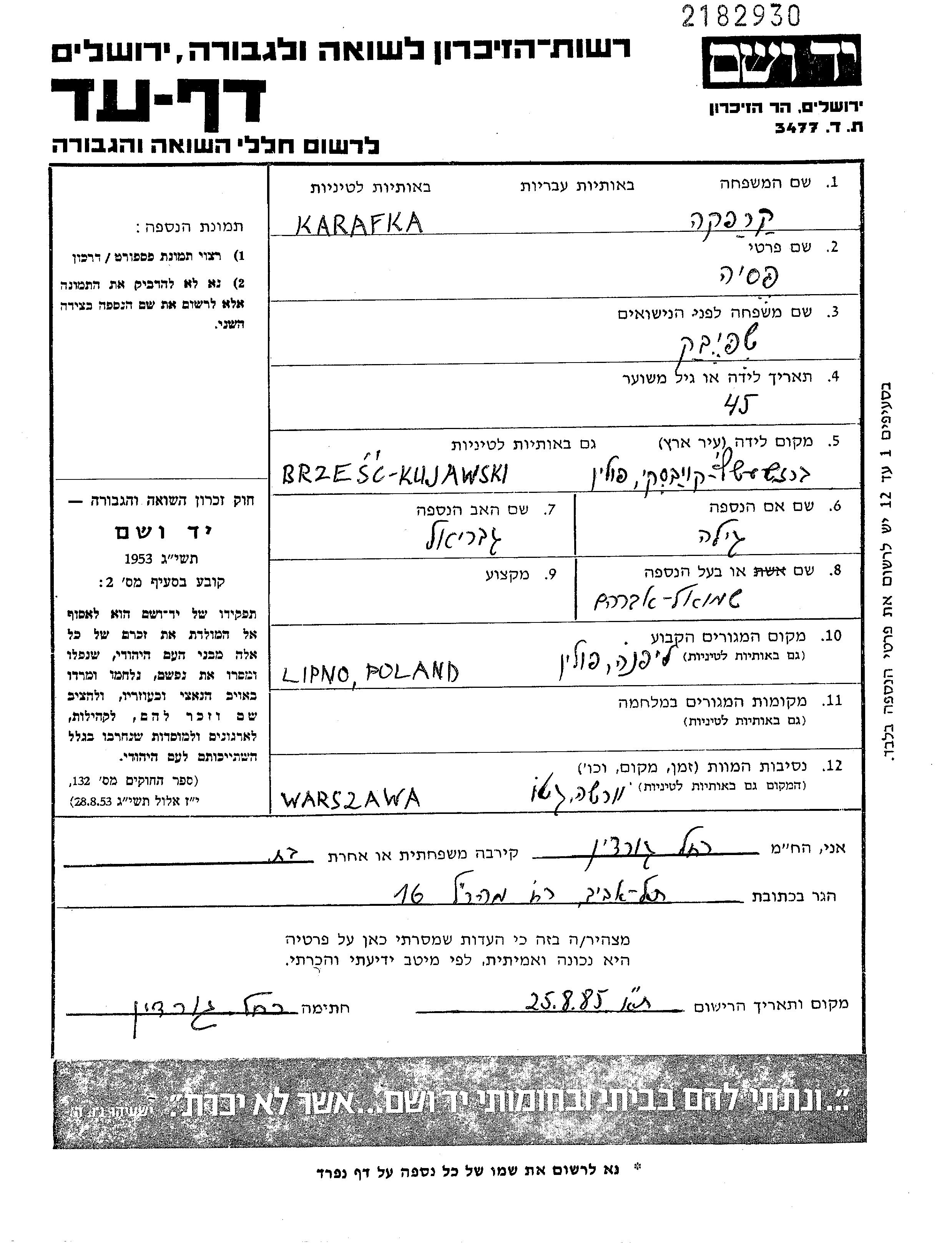 Pesi Lea Karafka, geb. Shpivak wurde im Jahr 1885 in Brzesc Kujawski, Polen geboren. Vor dem Zweiten Weltkrieg lebte sie in Lipno, Polen.