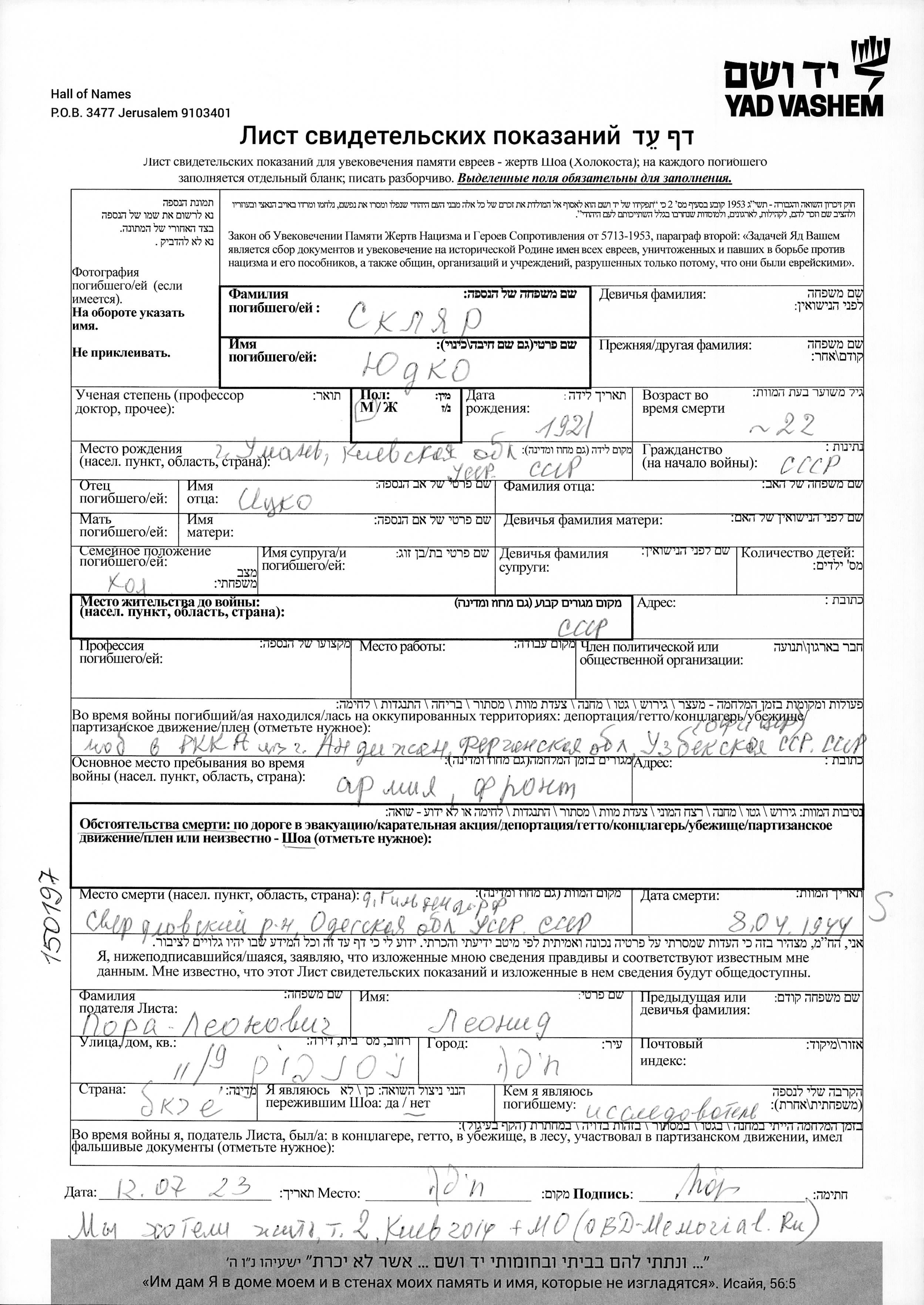 Iuda Sklyar wurde im Jahr 1921 in Uman, Ukraine (UdSSR) geboren. Er war Offizier. Vor dem Zweiten Weltkrieg lebte er in Uman, Ukraine (UdSSR).