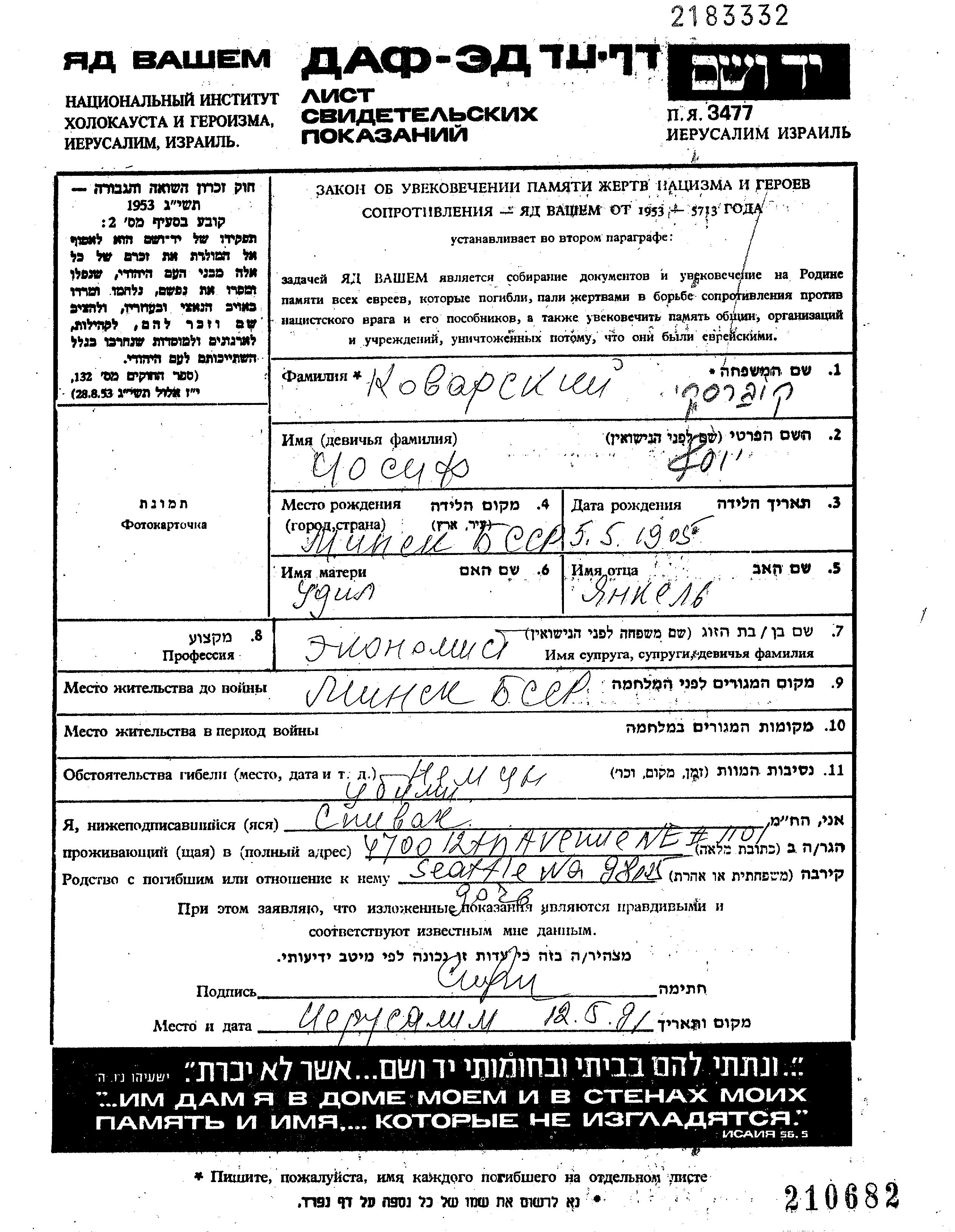 Iosif Kovarsky wurde im Jahr 1905 in Minsk, Weißrussland (UdSSR) geboren. Er war Ökonom/-in. Vor dem Zweiten Weltkrieg lebte er in Minsk, Weißrussland (UdSSR).
