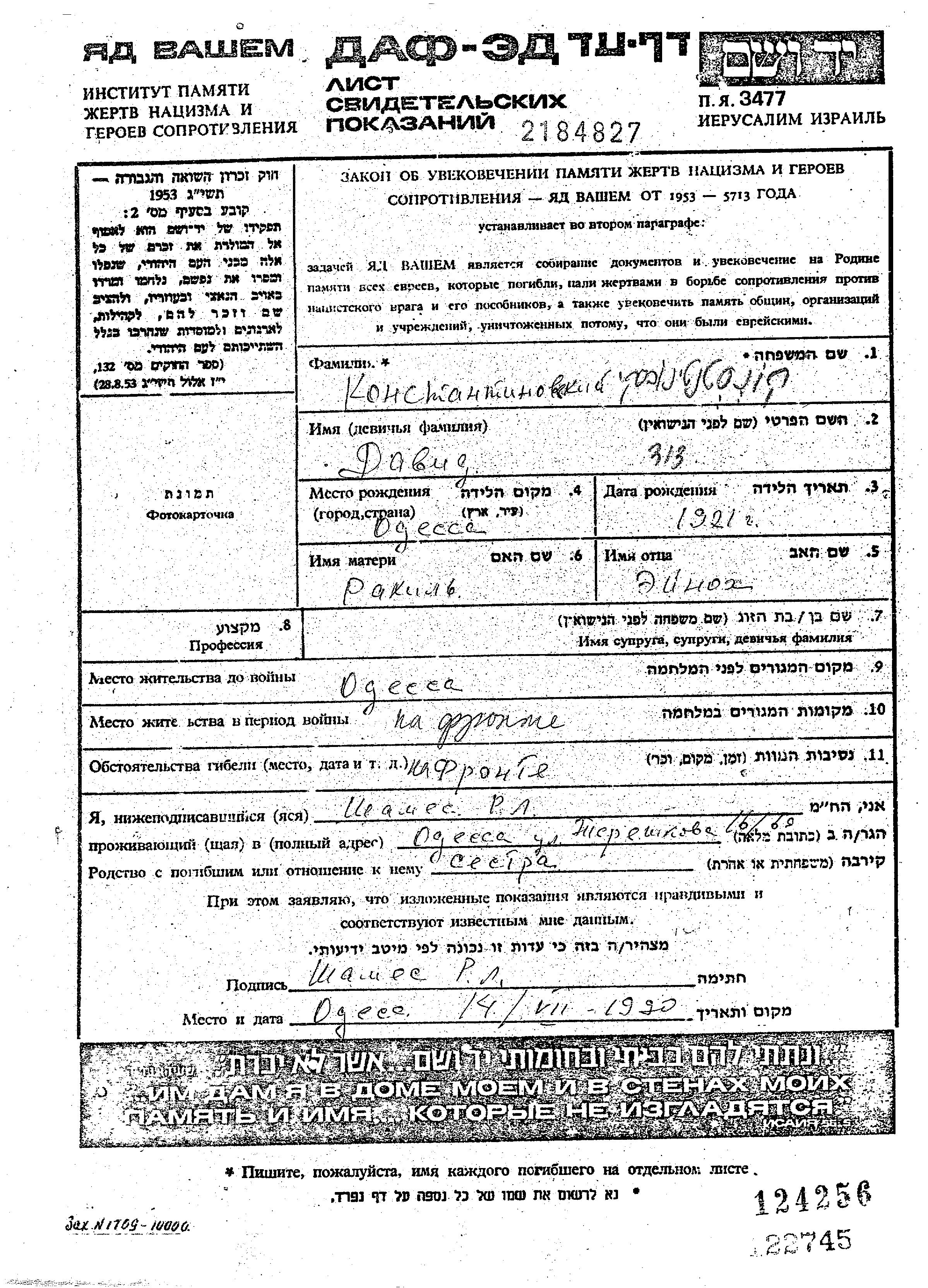Konstantinovski | David | 1921 | Odessa, Ukraine (UdSSR) | Gedenkblatt |