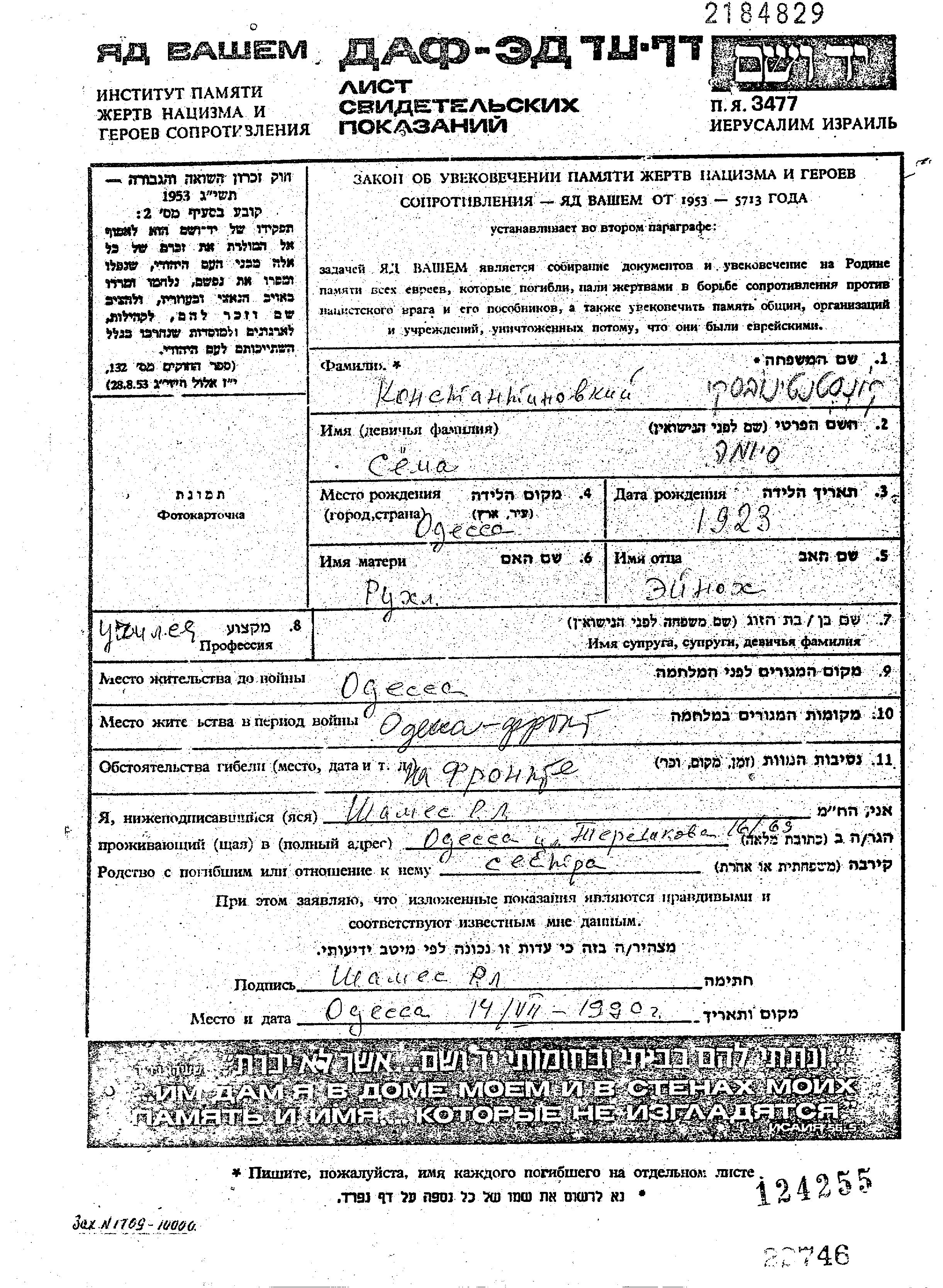 Semen wurde in der Schoah ermordet. Todesort: Odessa, Ukraine (UdSSR).