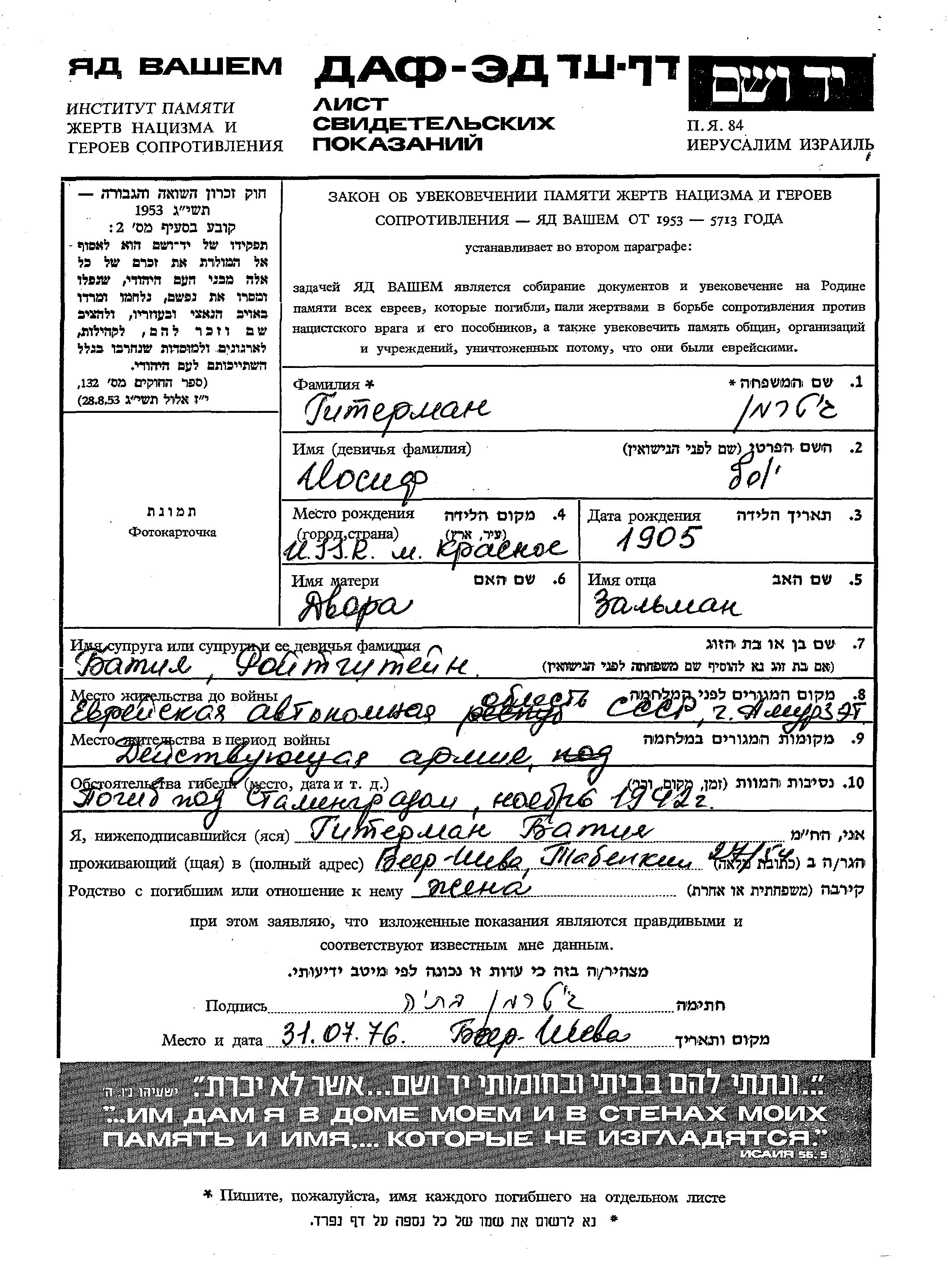 Iosif Giterman wurde im Jahr 1905 in Vinnitsa, Ukraine (UdSSR) geboren. Er war Armeeoffizier. Vor dem Zweiten Weltkrieg lebte er in Russland (UdSSR).