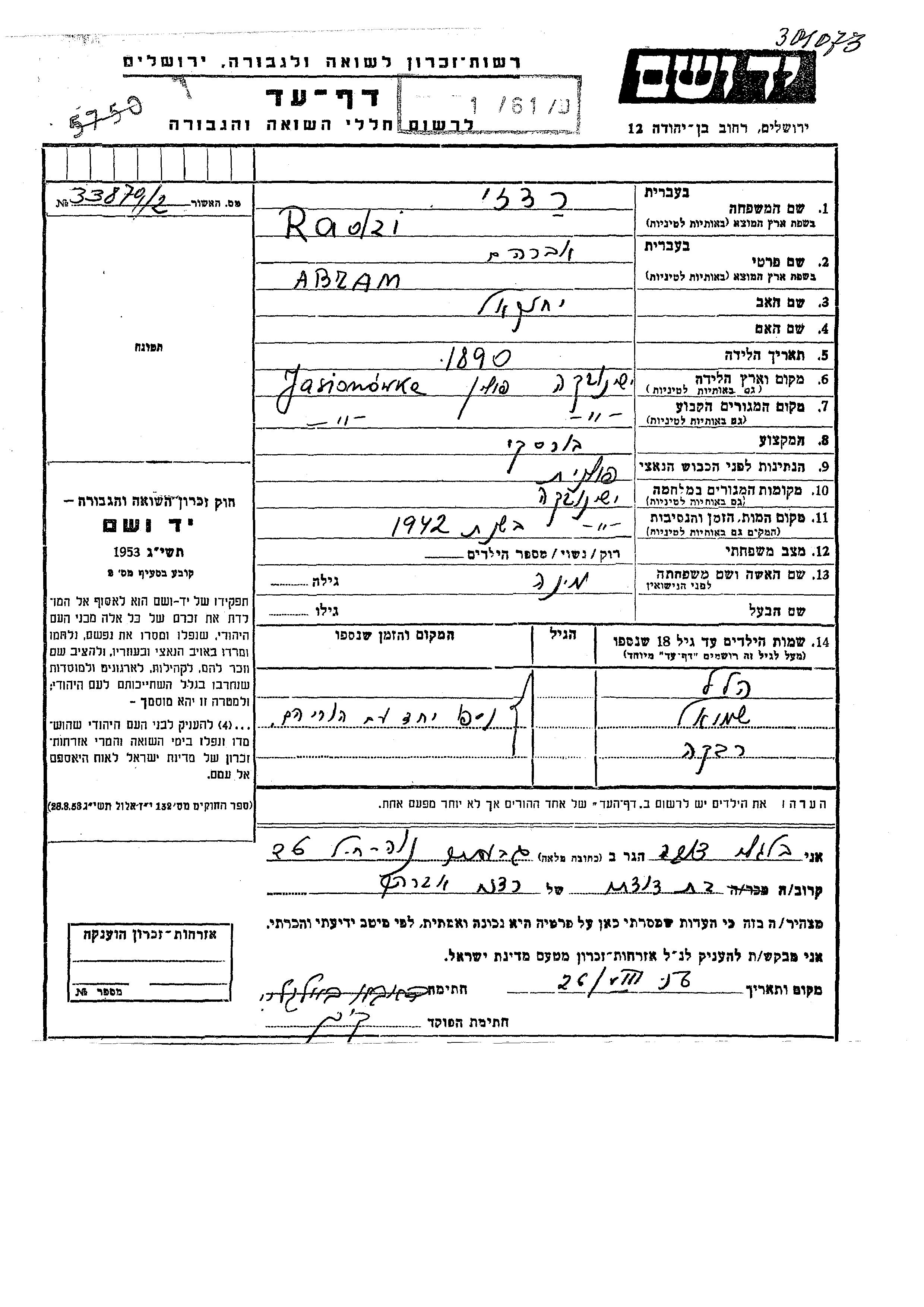 Hilel Radzi wurde in unbekannter Ort geboren. Vor dem Zweiten Weltkrieg lebte er in Jasionowka, Polen.