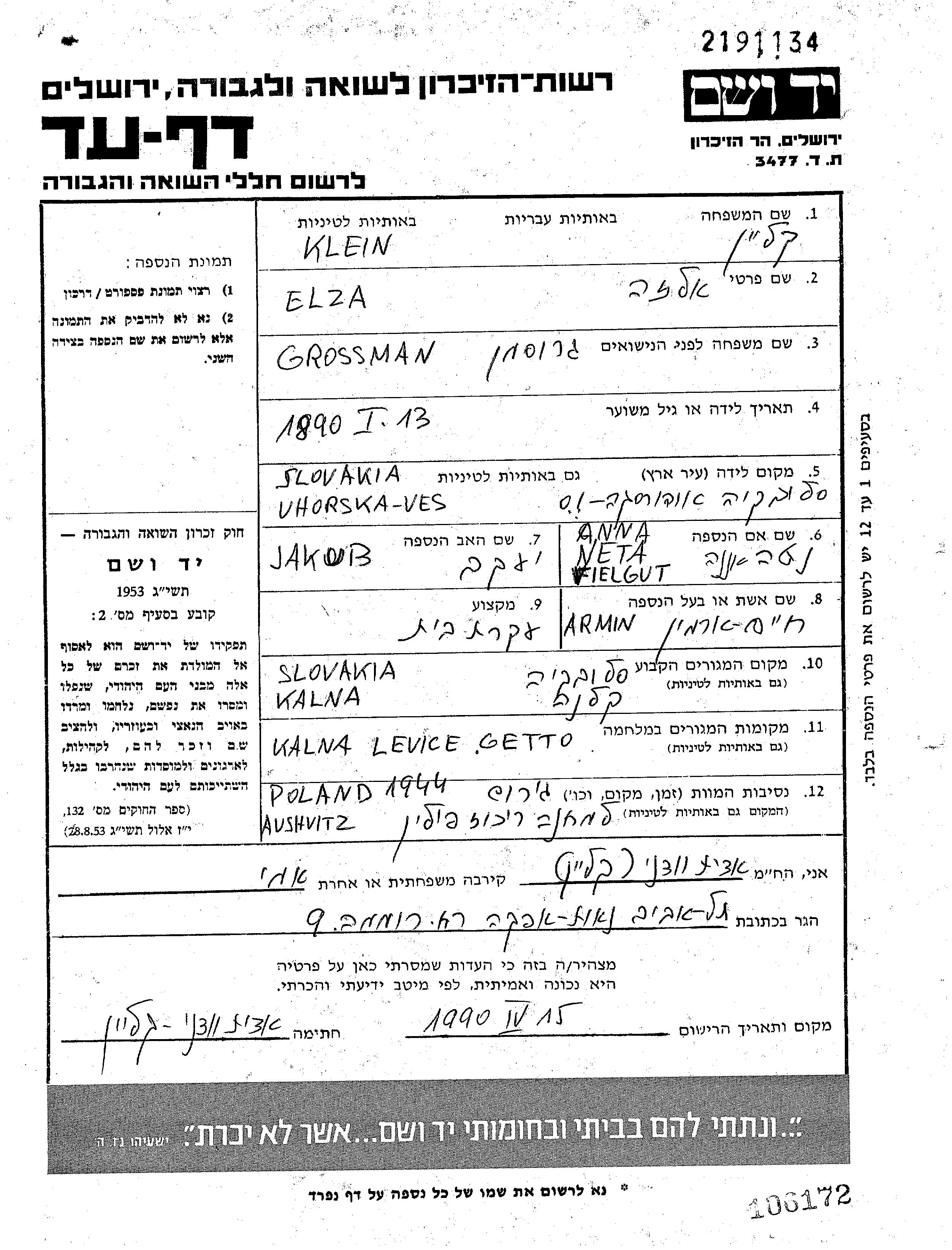 Elza Sara Klein, geb. Grossman wurde im Jahr 1890 in Uhorska Ves, Tschechoslowakei geboren. Sie war Hausfrau. Vor dem Zweiten Weltkrieg lebte sie in Kalna, Tschechoslowakei.