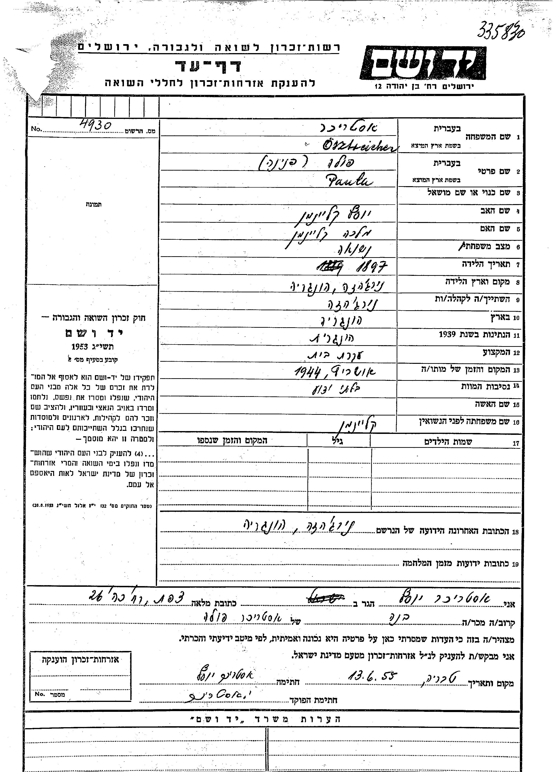 Paula Pnina Osztreicher, geb. Kleinman wurde im Jahr 1896 in Nyiregyhaza, Ungarn geboren. Sie war Hausfrau. Vor dem Zweiten Weltkrieg lebte sie in Nyiregyhaza, Ungarn. Paula Pnina wurde in der Schoah ermordet. Todesort: Auschwitz, Polen im Jahr 1944.