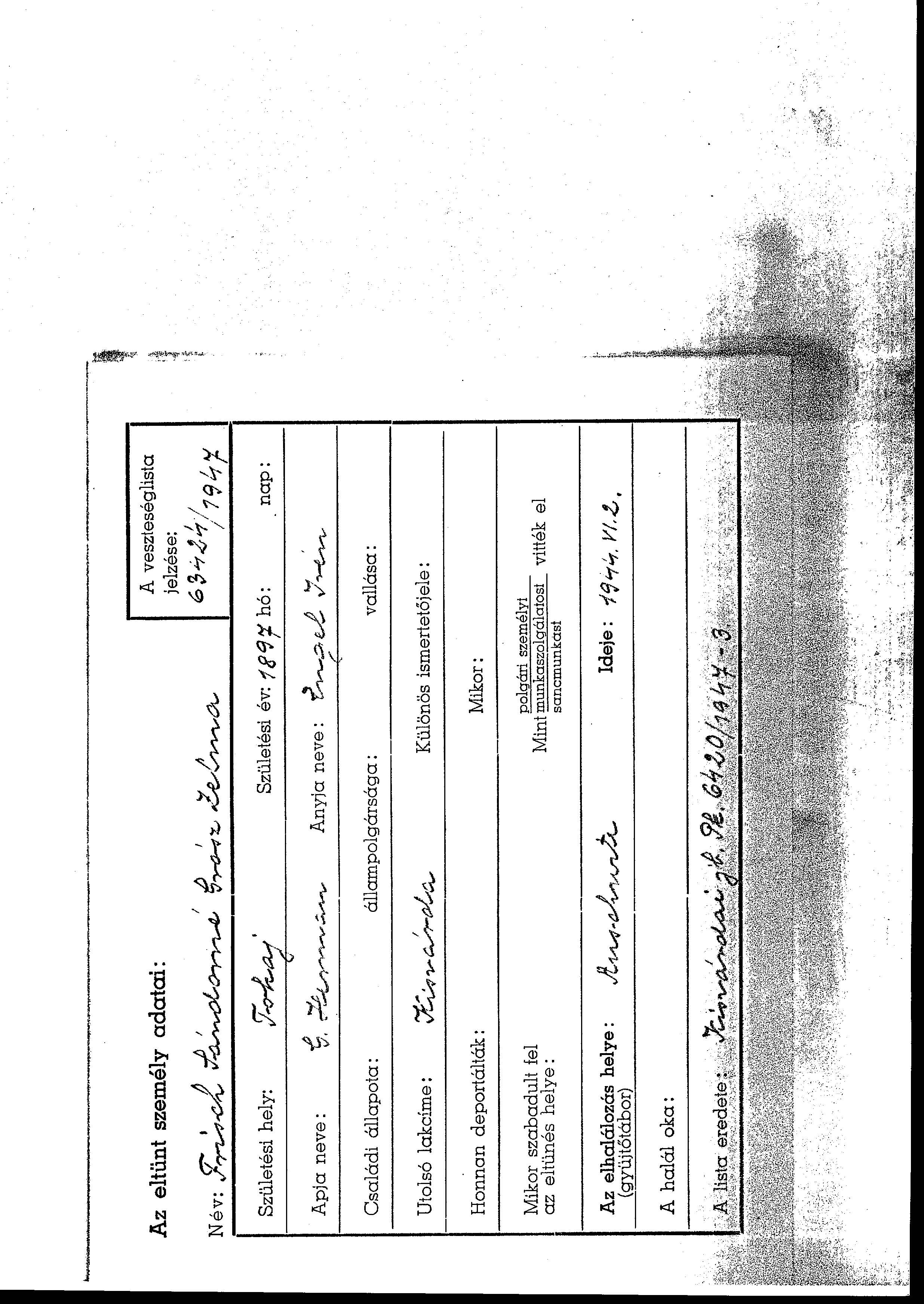 Zelma Frisch, geb. Grosz wurde in Tokaj, Ungarn geboren. Sie war Hausfrau. Vor dem Zweiten Weltkrieg lebte sie in Kisvarda, Ungarn. Zelma wurde in der Schoah ermordet. Todesort: Auschwitz, Polen im Jahr 02/06/1944.