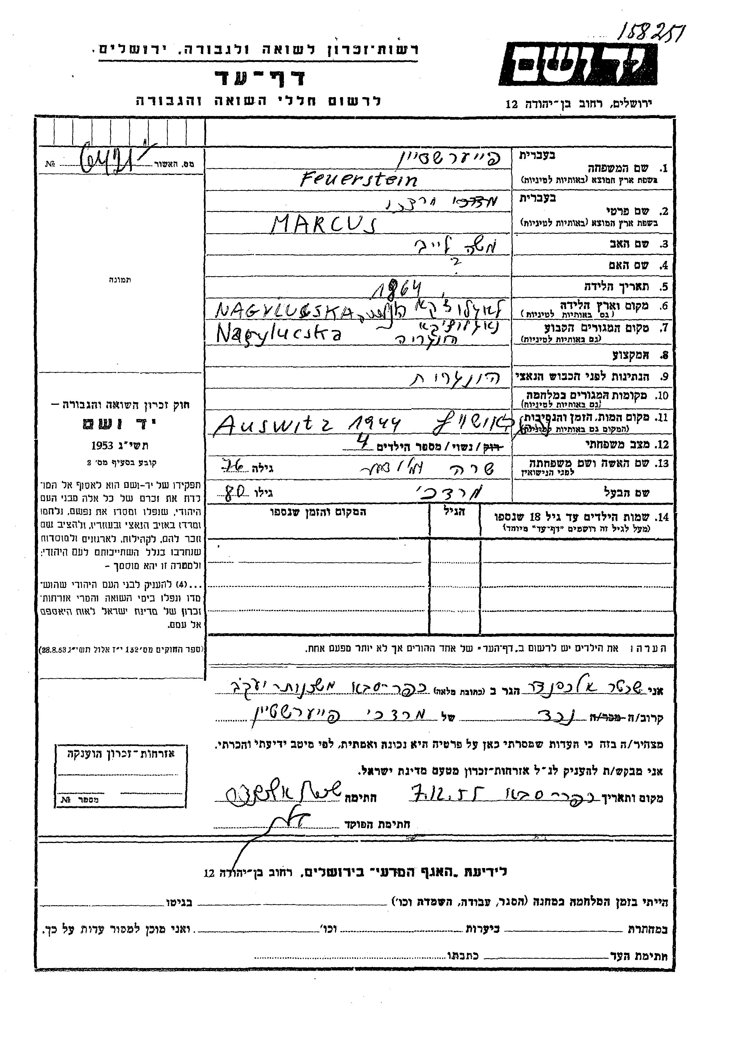 Marcus Mordekhai wurde in der Schoah ermordet. Todesort: Auschwitz, Polen im Jahr 1944.