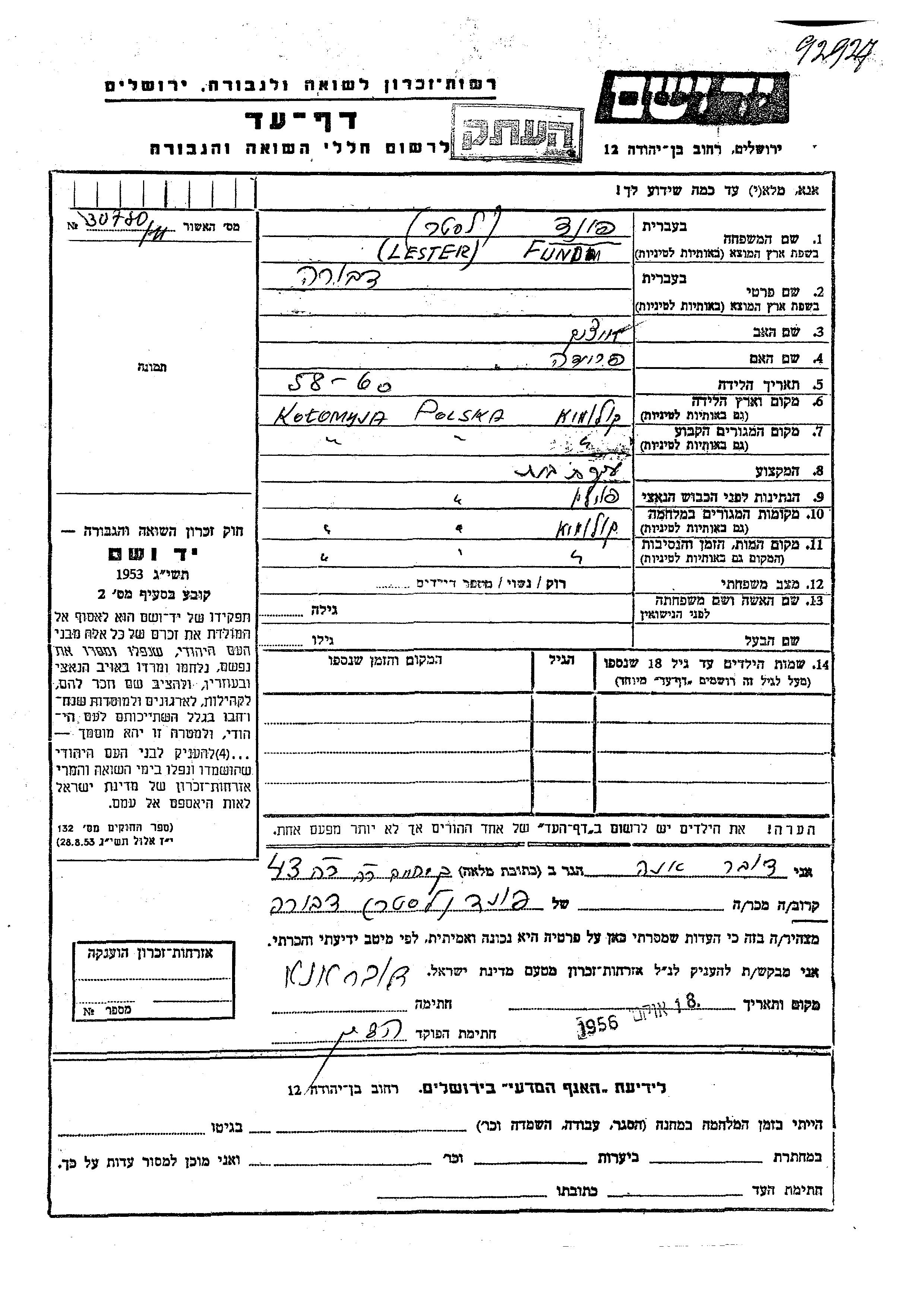 Dvora Fund, geb. Laster wurde in Kolomyja, Polen geboren. Sie war die Tochter von Itzik und Freida. Sie war Hausfrau und Verheiratet. Vor dem Zweiten Weltkrieg lebte sie in Kolomyja, Polen. Während des Krieges war sie in Kolomyja, Polen.
